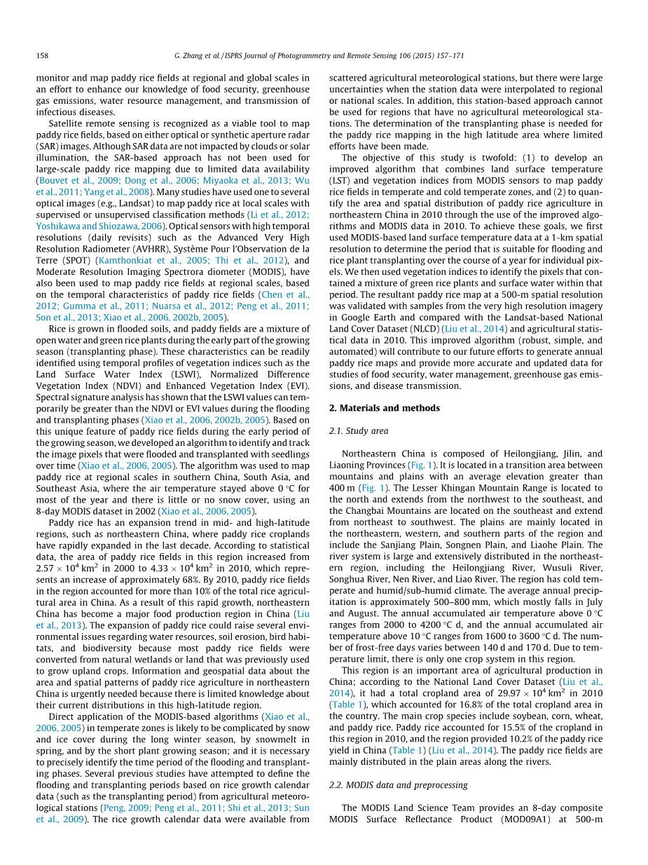 水稻在中高纬度地区有扩大的趋势,如中国东北地区,那里的稻田在过去十年里迅速扩大。据统计,该地区稻田面积由2000年的2.57times;104平方公里增加到2010年的4.33times;104平方公里,增幅约为68%。到2010年,该地区稻田面积占全国水稻农业总面积的10%以上。由于这种快速增长,中国东北已成为中国的主要粮食产区(Liu等人,2013年)。稻田的扩大可能会引发水资源、水土流失、鸟类栖息地和生物多样性等几个环境问题,因为大多数稻田都是从自然湿地或以前用于种植旱地作物的土地改建而来的。中国东北地区水稻农业的面积和空间格局的信息和地理空间数据是迫切需要的,因为目前对这一高纬度地区的水稻农业分布情况的了解是有限的,因此迫切需要有关这一高纬度地区水稻农业面积和空间格局的信息和地理空间数据。