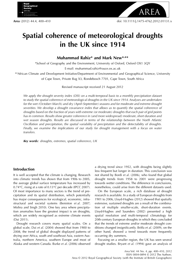 众所周知,气候是一直在变化的。研究气候趋势表明,1906年至2005年,全球平均地表温度上升了0.74°C,它在以每十年0.13℃(IPCC 2007)的速度上升。最重要的是许多部门研究出降水趋势和其空间分布可能对生态,经济,基础设施造成严重后果。其中一个关键领域,异常产生最大的影响是在干旱,这被广泛认为是极端气候事件,干旱研究涵盖了很多的内容。