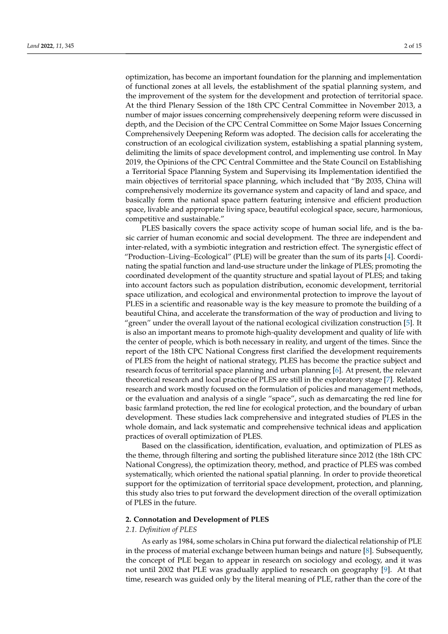 以PLES的分类、识别、评价与优化为主题,通过对2012年(党的十八大)以来已发表文献的过滤和整理,系统梳理了PLES优化理论、方法和实践,为国土空间规划提供了导向。为了给国土空间开发、保护、规划的优化提供理论支持,本研究还试图提出未来总体优化的发展方向。