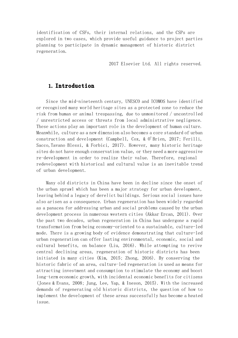 自城市蔓延开始以来,中国许多老区都在衰落,这是城市发展的一项重大战略,留下了一批废弃建筑。因此也出现了严重的社会问题。人们普遍认为,城市更新是解决许多西方城市城市发展过程中造成的城市和社会问题的灵丹妙药(Akkar Ercan,2011)。在过去的二十年里,中国的城市更新经历了一个从以经济为导向到以文化为主导的可持续发展模式的快速转变。越来越多的证据表明,总的来说,以文化为主导的城市更新能够提供持久的环境、经济、社会和文化效益(Liu,2016)。在试图复兴中部衰退地区的同时,许多城市开始了历史街区的重建(Kim,2015;Zhong,2016)。通过保护一个地区的历史结构,以文化为主导的复兴被用作吸引投资和消费的手段,以刺激经济和促进长期经济增长,同时为公民带来附带的经济利益(Jonesamp;Evans,2008;Jung,Lee,Yap和Ineson,2015)。随着历史街区更新改造需求的不断增加,如何顺利实施历史街区的开发建设成为一个热点问题。