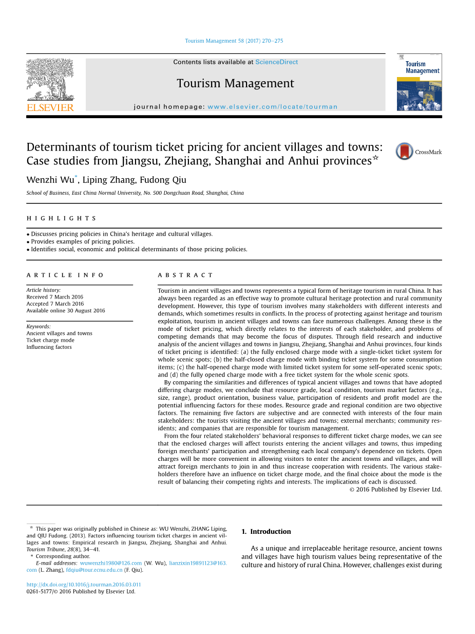 古村镇旅游门票价格的决定因素——以江、浙、沪、皖四省为例*外文翻译资料