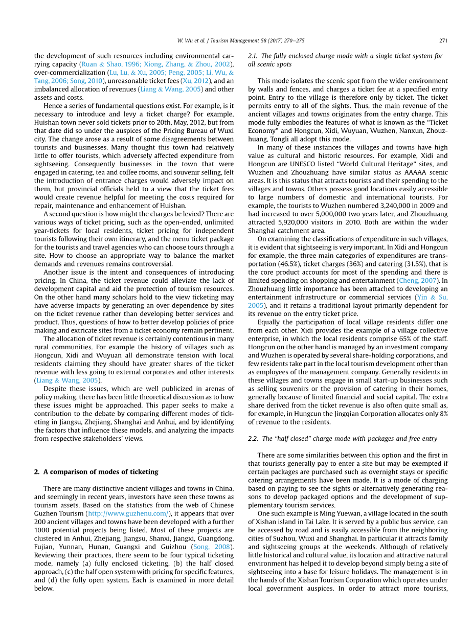 证据似乎表明,那些具有独特的、历史资源得到很好的保护、营销意识强、地理位置优越、往往开发较早的旅游资源村落,往往采用全封闭的门票收费模式。在2010年和2011年,乌镇的门票收入超过2.7亿元人民币。这些巨额收入可以用来保护和改善资源。资源越好,在吸引游客方面就越成功,保护古镇的压力就越大。单次充电加强管理控制,抑制外部诱导的活动。虽然这这种方法在很大程度上依赖于村庄的景观质量,它确实允许更好地控制承载能力,减少游客拥挤和过度商业化。因此,有效地保护历史风貌和传统风貌是可能的。因此,周庄镇自2008年以来每年的游客人数限制在300万。