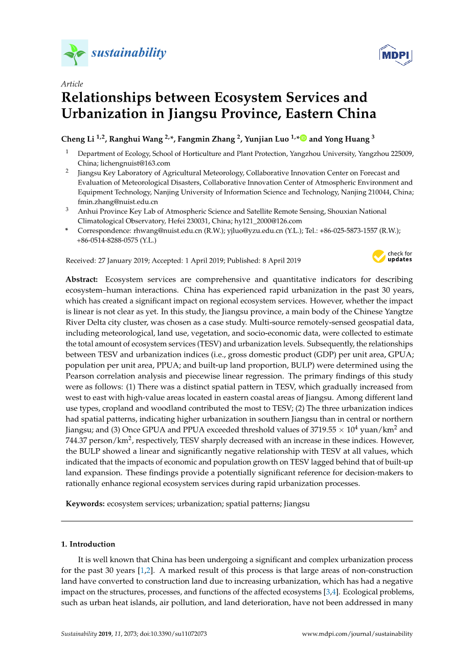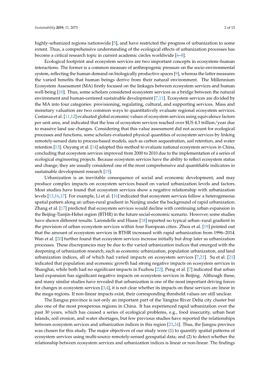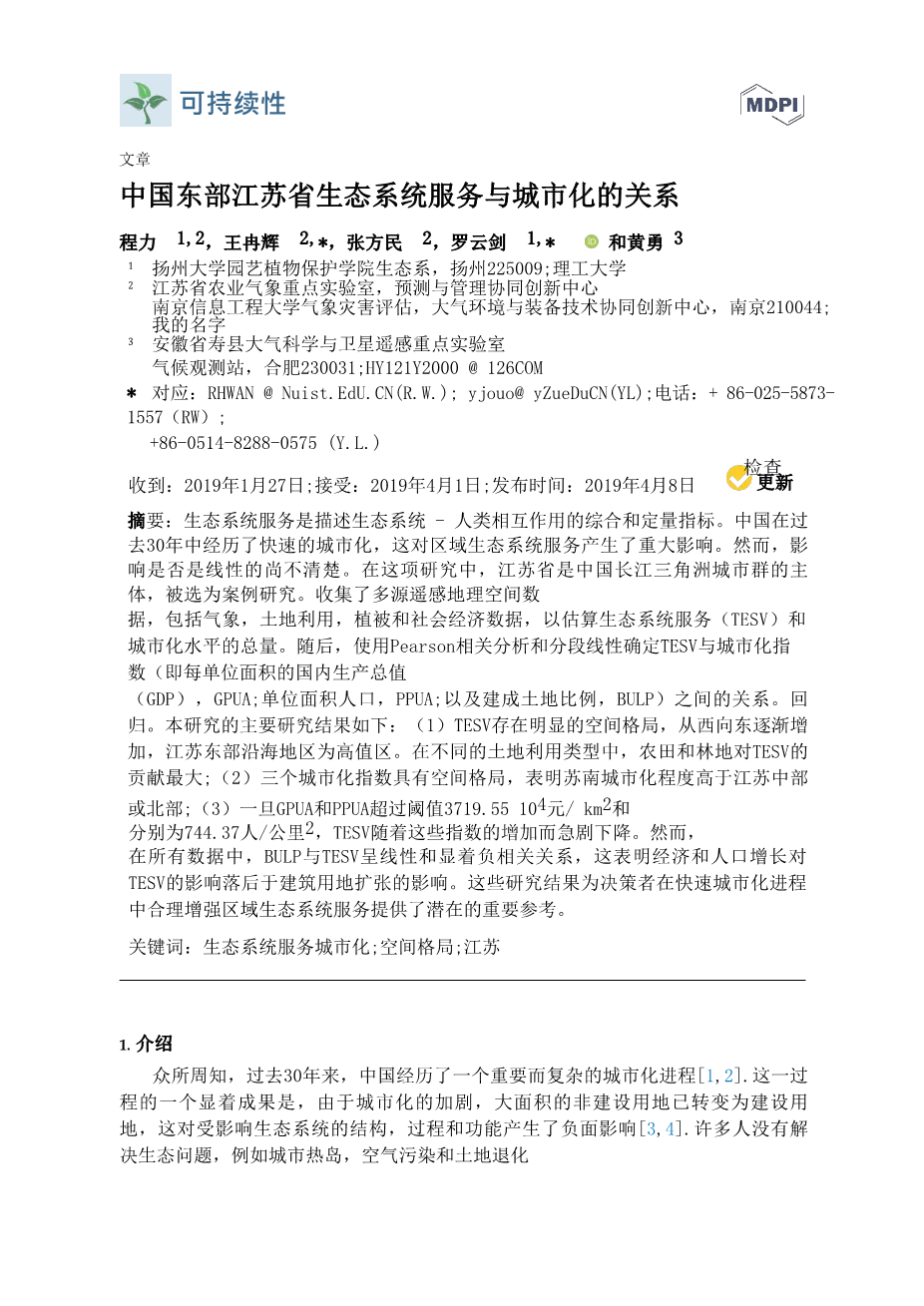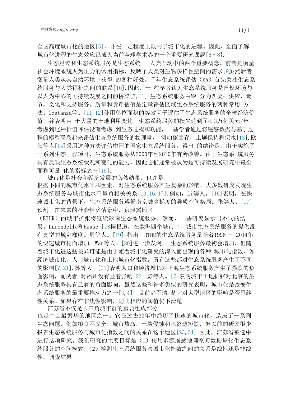 中国东部江苏省生态系统服务与城市化的关系外文翻译资料