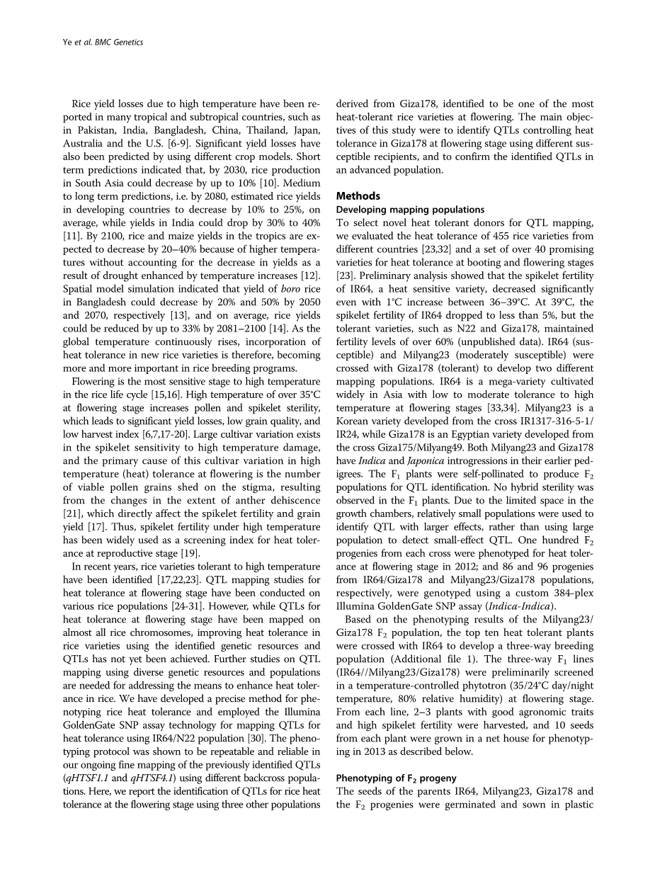 背景 :气候变化影响着很多国家的粮食产量,生产新型耐热水稻品种是未来全球变暖趋势下的本质要求。我们曾报告过高温热害在IR64/N22种系的开花期影响水稻结实率的四个原因。为了进一步探究另外的数量性状位点(QTLs),我们通过两个二代亲本F2和一个三元杂交获得的来自耐热品种Giza178的 F2来鉴别和确认在开花期控制耐热性能的QTL。