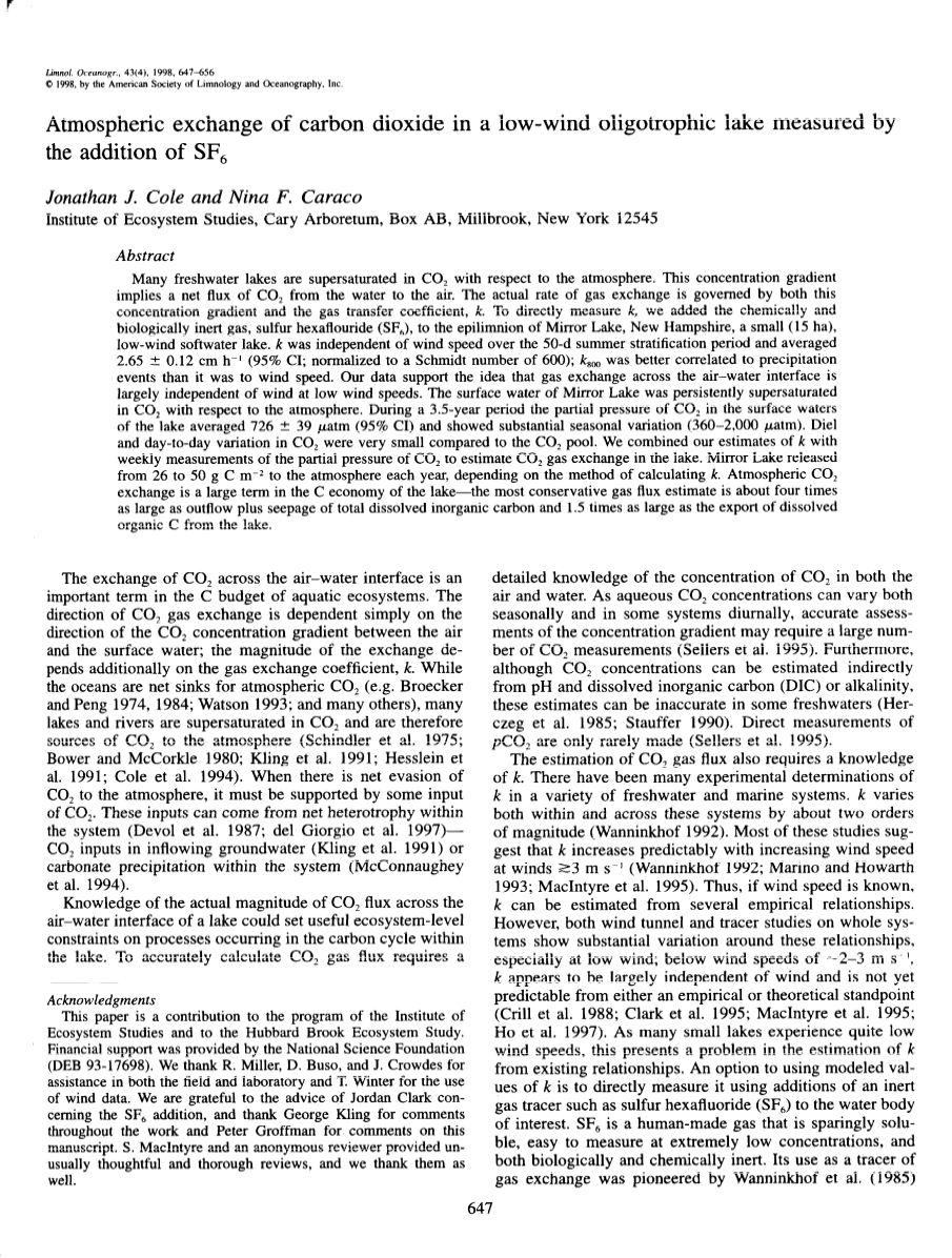 在本次研究中,通过直接估测小型低风贫营养湖中的k值,我们一起直接测量了CO2浓度的昼夜、季节和年际间的变化。k值是通过在70天的期间向整个湖泊添加SF6来估测的。我们创建了两个新模型来解释k值的变化,一个模型只完全基于风速而另一个模型则基于风速和降水。然后我们使用这些k值的模型结合我们的CO2浓度数据记录来计算CO2气体通量。