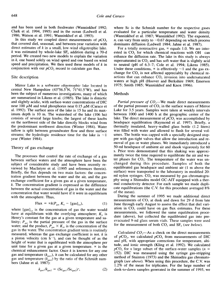 对于某种完全不发生化学反应的气体,amp;的值等于1。我们对CO2与OH发生化学反应增强扩散速率这一现象感兴趣。在该项研究中的湖泊总是处于CO2过饱和状态,同时湖水是具有微酸性的软水。在这些条件下,amp;可以有效率地近似达到1,同时CO2的气体交换过程不受可以增强CO2渗入不饱和高pH水体的化学反应的影响。