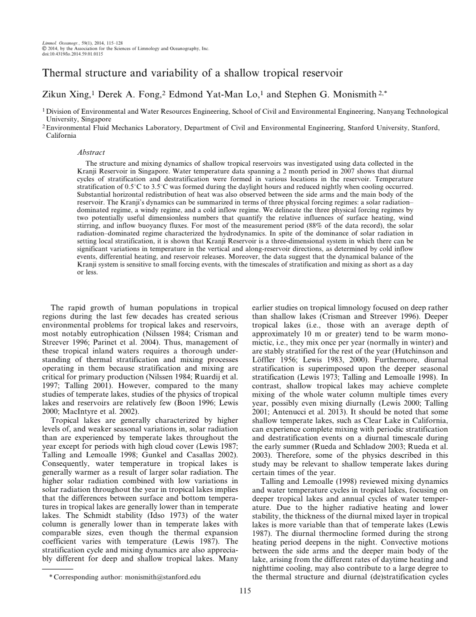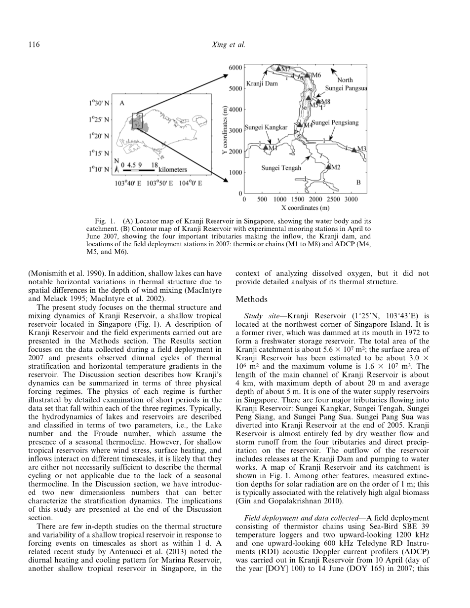 关于浅层热带水库的热结构和可变性在时间尺度上强迫事件的响应时间短于1d的研究很少。Antenucci等人最近的一项相关研究(2013)在分析溶解氧的背景下注意到新加坡另一个浅水热带水库Marina水库每天的加热和降温模式,但没有提供对其热结构的详细分析。