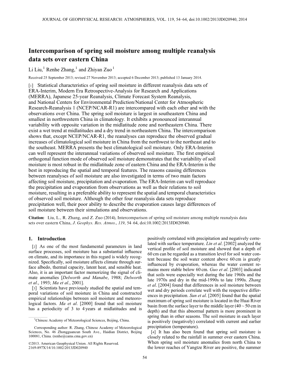 因为土壤湿度对气候变化有着重要的影响作用,所以我们必须获得高时空分辨率的数据,并了解土壤湿度的时空变化特征。然而由于其较难观测,且设备价格昂贵,所以导致观测资料匮乏。由于观测资料较少以及空间覆盖范围较小,因此仅有一个很短的期限(大概10年)的数据可用来气候诊断。高分辨率观测资料的缺乏限制了土壤气候的研究(Ma等)。鉴于此,很多科学家试图寻找一套能够代替观测资料的高分辨率的资料。Zuo等发现ERA-40的土壤湿度再分析资料很好的再现中国东部春季土壤湿度的时空特征。Zhang等将再分析资料与观测资料进行了比较,并指出ERA-40在土壤湿度的年际和年代际变化上有较高的适用性。并发现前期降水会增加土壤湿度,但土壤湿度异常对后期降水的影响则不显著。气温与土壤湿度的关系则较复杂,不同的区域有不同的特征。Wang等指出由于使用CFSR的的多种数据造成了土壤湿度的虚假增长,这将给分析土壤湿度的变化趋势增加难度。