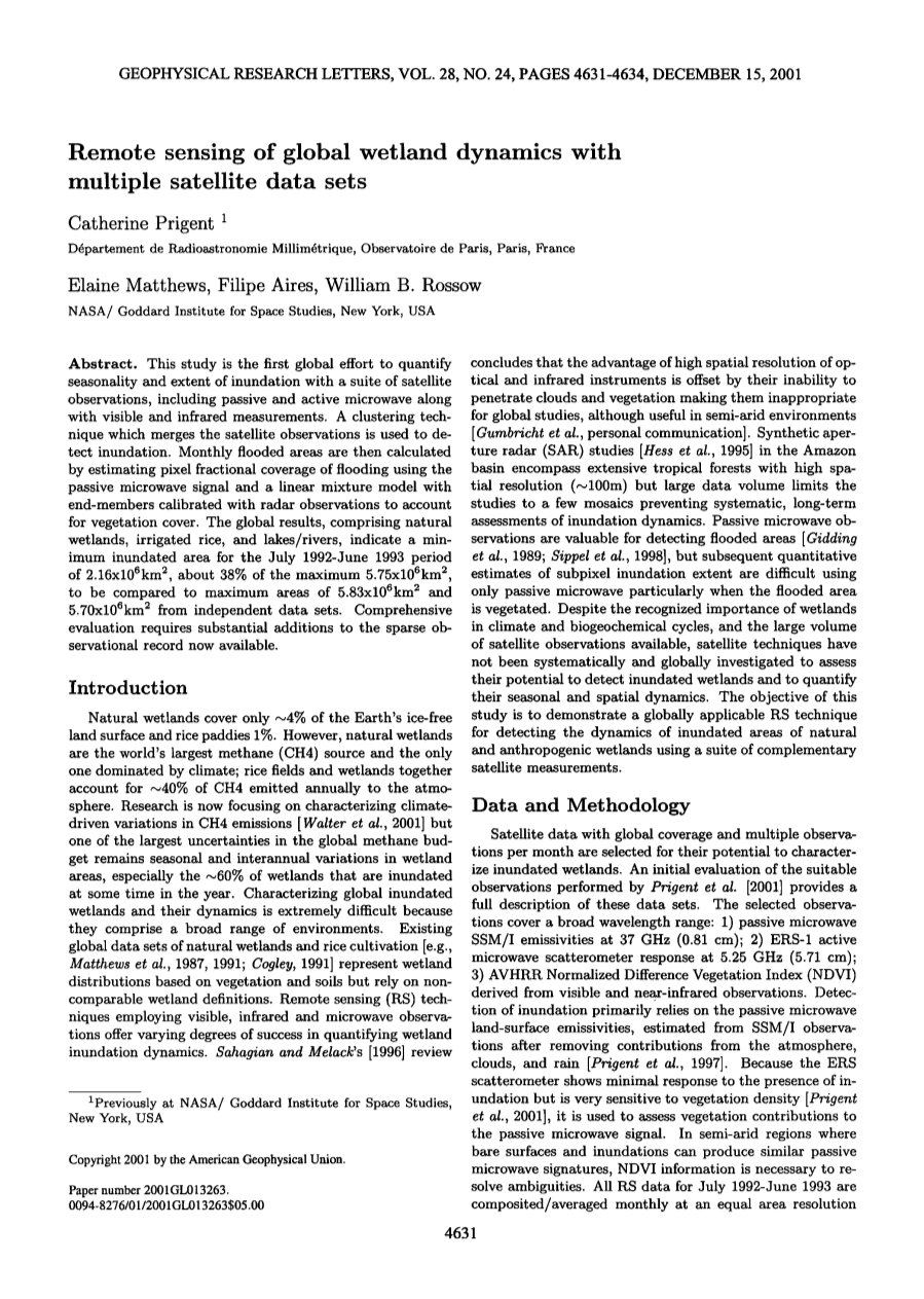 天然湿地只占地球无冰地表的约4%,稻田占约1%。然而,天然湿地是世界上最大的甲烷(CH4)来源,也是唯一受气候影响的湿地;稻田和湿地的排放占每年排放到大气中的CH4的约40%。目前的研究重点是气候驱动CH4排放变化的特征[Walter et al.,2001],但全球甲烷预算中最大的不确定性之一仍然是湿地地区的季节性和年际变化,特别是约60%的湿地在一年中某些时候是被淹没的。表征全球淹没湿地及其动态特征非常困难,因为它们包含广泛的环境。现有的自然湿地和水稻种植全球数据集[e.g., Matthews et al,,1987,1991; Cogley,1991]代表了基于植被和土壤的湿地分布,但依赖于不能很好适用的湿地定义。使用可见光,红外和微波的遥感技术观测在量化湿地淹没动力学方面提供了不同程度的成功。Sahagian和Melack [1996]的综述得出结论认为,光学和红外仪器的高空间分辨率优势被其无法穿透云层和植被所抵消,使其不适用于全球研究,尽管在半干旱环境中有用[Gumbricht et al., personal communication]。亚马逊流域的合成孔径雷达(SAR)研究[Hess et al.,1995]涵盖了高空间分辨率(~100m)的广泛热带森林,但数据量很大,将研究限制在少数马赛克上,以防止对淹没动态进行系统的长期评估。 被动微波观测对于探测洪水淹没区域是有价值的[Gidding et al.,1989; Sippelet et al., 1998],但是仅使用无源微波,特别是在洪水泛滥地区植被时,后续的亚像元淹没范围的定量估计是困难的。尽管人们认识到湿地在气候和生物地球化学循环中的重要性以及大量可靠的卫星观测资料,但卫星技术尚未经过系统和全球调查,以评估它们探测淹没湿地的潜力并量化其季节和空间动态。本研究的目的是展示一种全球适用的遥感技术,用于利用一套互补的卫星测量来检测自然和人为湿地淹没区域的动态。