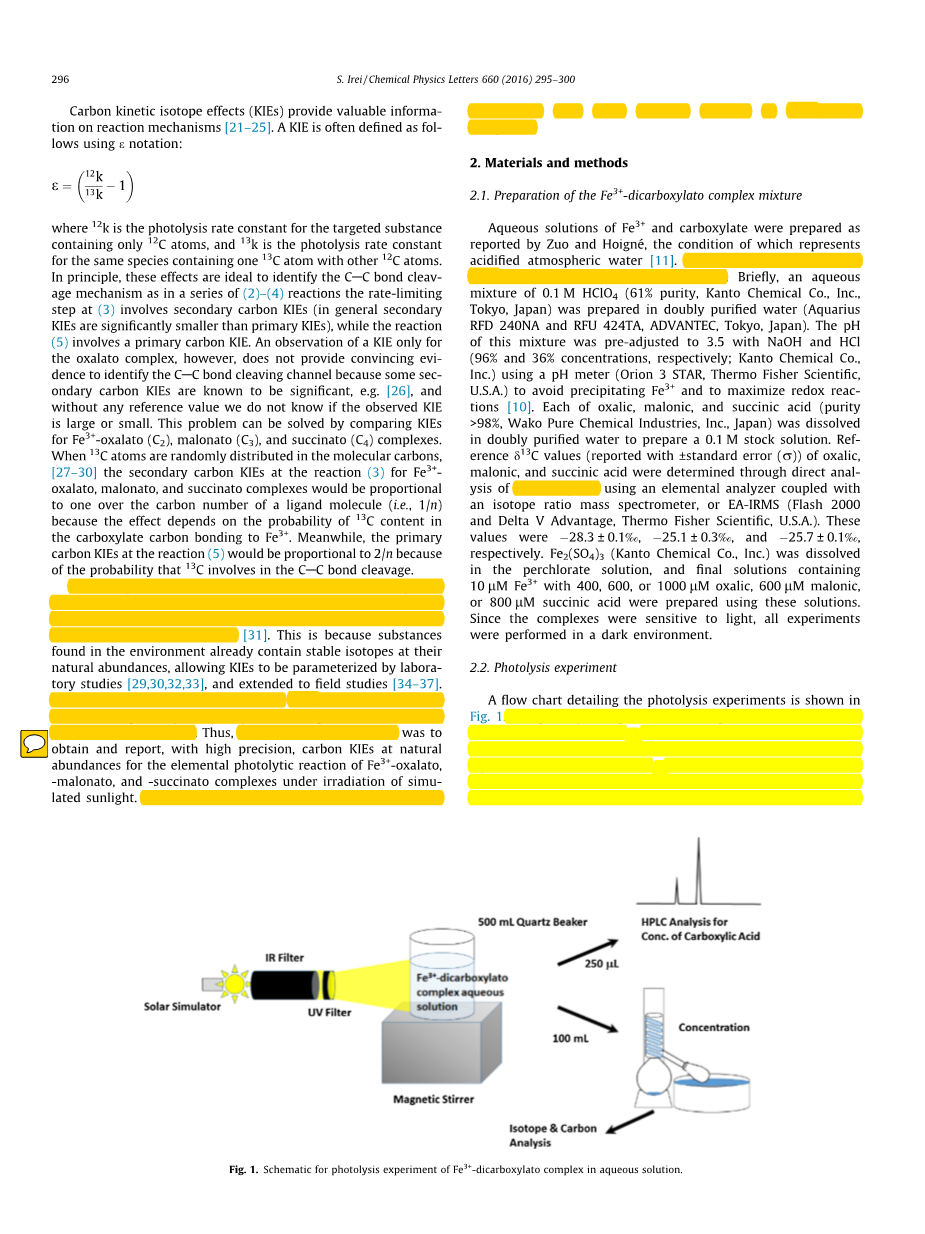 以特定元素反应获得的天然丰度来测量KIEs不仅有助于阐明反应机理,还能评估自然环境中元素化学反应的程度[31]。这是因为在环境中发现的物质已经含有稳定的同位素,其自然丰度允许KIE通过实验室研究参数化[29,30,32,33],并扩展到实地研究[34-37]。尽管已经报道了用于Fe3 -羧基络合物光解的KIE [38,39],但它们不是在阳光下C-C键裂解。因此,本研究的目的是在模拟太阳光照射下,以高精度获得和报道天然丰度的碳KIEs,用于Fe3 -草酸根,丙二酸盐和琥珀酸盐复合物的元素光解反应。然后将所得的KIE用于鉴定Fe3 -草酸根络合物的未识别C-C键裂解反应。