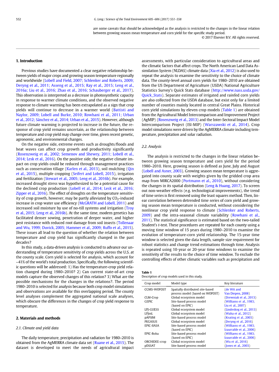 消极看来,诸如干旱、火灾和热浪等极端事件(Rosenzweig等,2002; Semenov和Shewry,2011; Lobell等,2014; Lesk等,2016),积极的一面是,通过管理措施,如保护性耕作(Karlen 等,2013),土壤覆盖(Qin 等,2015),多种作物(Seifert和Lobell,2015) ),灌溉和施肥(Stewart 等,2005; Leng 等,2016b)都可以显著影响作物生长和生产力。例如,干旱胁迫的增加被认为是作物生产下降的潜在原因(Lobell 等,2014; Lesk 等 ,2016; Zipper等,2016),然而,干旱对作物生长的温度敏感性的影响可能部分缓解了CO2提高作物水分利用效率的诱导(McGRATH和Lobell,2011),并通过使用免耕系统和灌溉来增加土壤水分(Troy 等,2015; Leng等,2016b)。同时,现代遗传学促进了更密集的播种,更深层次的水渗透和更高的害虫抗性,减少了土壤昆虫对根系的损伤(Tollenaar and Wu,1999; Duvick,2005; Hammer 等,2009; Ruffo 等 ,2015)。 这些问题都导致了过去几十年温度与作物产量之间的关系是否有显著变化。
