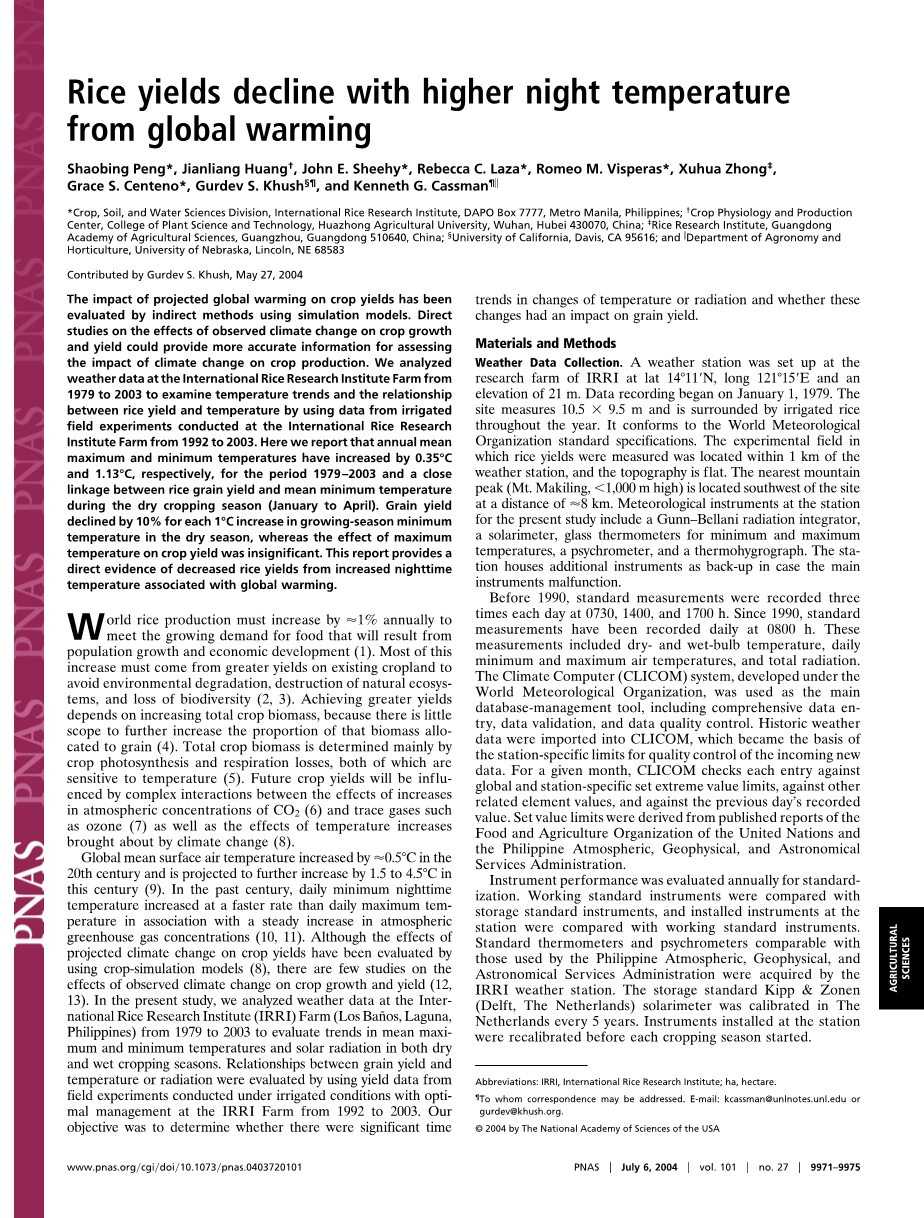 Shaobing Peng*, Jianliang Huangdagger;, John E. Sheehy*, Rebecca C. Laza*, Romeo M. Visperas*, Xuhua ZhongDagger;,Grace S. Centeno*, Gurdev S. Khushsect;para;, and Kenneth G. Cassmanpara;