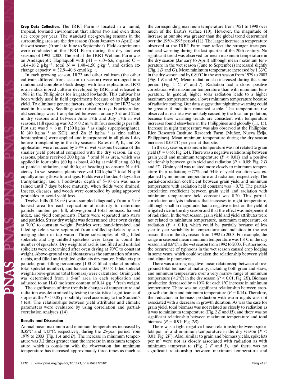 二十世纪,全球平均地表空气温度上升了约0.5℃,预计本世纪将会进一步升高1.5至4.5℃。在过去的一个世纪中,大气中温室气体浓度稳定增加,夜间日最低气温上升速度比日最高气温更显著。虽然通过使用作物模拟模型,对预测的气候变化对作物产量的影响进行了评估,但是对观察到的气候变化对作物生长和产量影响的研究很少。在本研究中,我们分析了从1979到2003年在国际水稻研究所(IRRI)农场(洛斯巴诺斯,丽,菲律宾)的气象数据,从而来评估在干、湿作物季节平均最高和最低气温以及太阳辐射的变化趋势。通过利用1992至2003年在IRRI农场最优灌溉管理条件下田间试验的产量数据,粮食产量与温度以及辐射之间的关系得以评估。我们的目标是确定温度或辐射是否有显著的时间变化趋势,以及这些变化是否对粮食产量有影响。