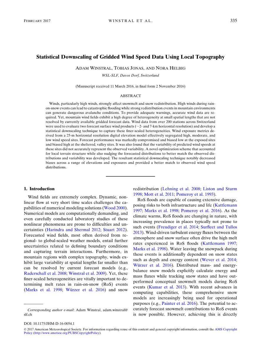 相反的,Winstral et al. (2009),找到了风速变化和地形参数之间的紧密关系。他们得出风速在不同地形的不均匀性能够在高分辨率的情况下用这个简单的地形参数大约估计出来。这个地形参数是一个有方向性的基于斜率的对地形遮盖与曝光度的评估,其曾经被用于在模式定义域内分散小时风速的观测(Kumar et al. 2013; Marks et al. 2002; Winstral et al.2014)。Sx参数和其他地形的变化参数也曾被用于对高低速风速的描述从而确定由风引起的雪的重分布的影响的参数(Anderton et al. 2004; Erickson et al. 2005; Purves et al. 1998; Schirmer et al. 2011;Winstral et al. 2013)。目前的工作面临着这样的挑战-----从单一的预报单位中得到次网格的特性----这与在变化的地形处分布某个单一的测量难度有相似之处。