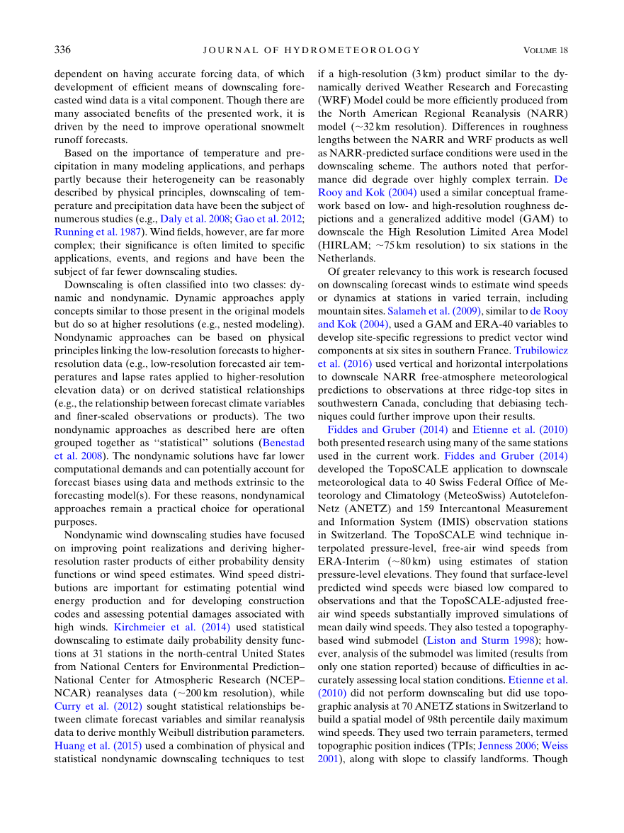 Fiddes and Gruber (2014)和Etienne et al. (2010)在目前的工作中都运用了很多相同测站的数据提出了研究。Fiddes and Gruber (2014)运用地形层面的应用将40个瑞士气候办公室和159个IMIS观测站的数据进行了降尺度分析。此TopoSCALE地形层面的风能测算技术是利用了欧洲中心运用的测站海拔压力的预估的再分析(80km)做出了一系列的插值运算。他们发现表层的预测风与观测数据相比偏差较小,通过地形层面校正的大气风速实质上平均每日风速的模拟。他们也做了一个建立在地形基础上的有关风的子模型(Liston and Sturm 1998);然而,对于这个子模型的分析却是有限的(因为只有一个测站报告)因为很难准确评估当地测站状况。Etienne et al.(2010)没有运用降尺度的方法但运用了瑞士70ANETZ的测站进行地形分析和每日最大风速的98%去建立了一个空间模型。我们用两个地形参数,称作地形指数(TPIs; Jenness 2006; Weiss 2001),结合斜坡斜度去分类各种不同的地形。即使统计模型选择标准始终使其地形上的预测与风的模型结果不相匹配,作者始终坚持其建立于地形变化上的内在关系是”风流场上最有影响力的参数” (Etienne et al. 2010, p. 1962)。