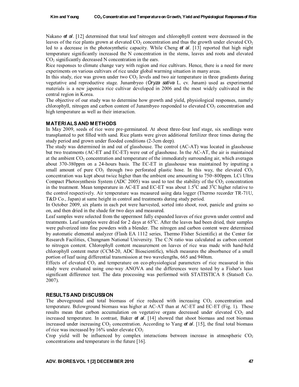 CO2浓度和温度升高对水稻的生长、产量和生理响应的影响(Oryza sativa L. cv. Junam)外文翻译资料
