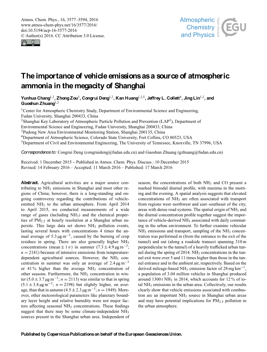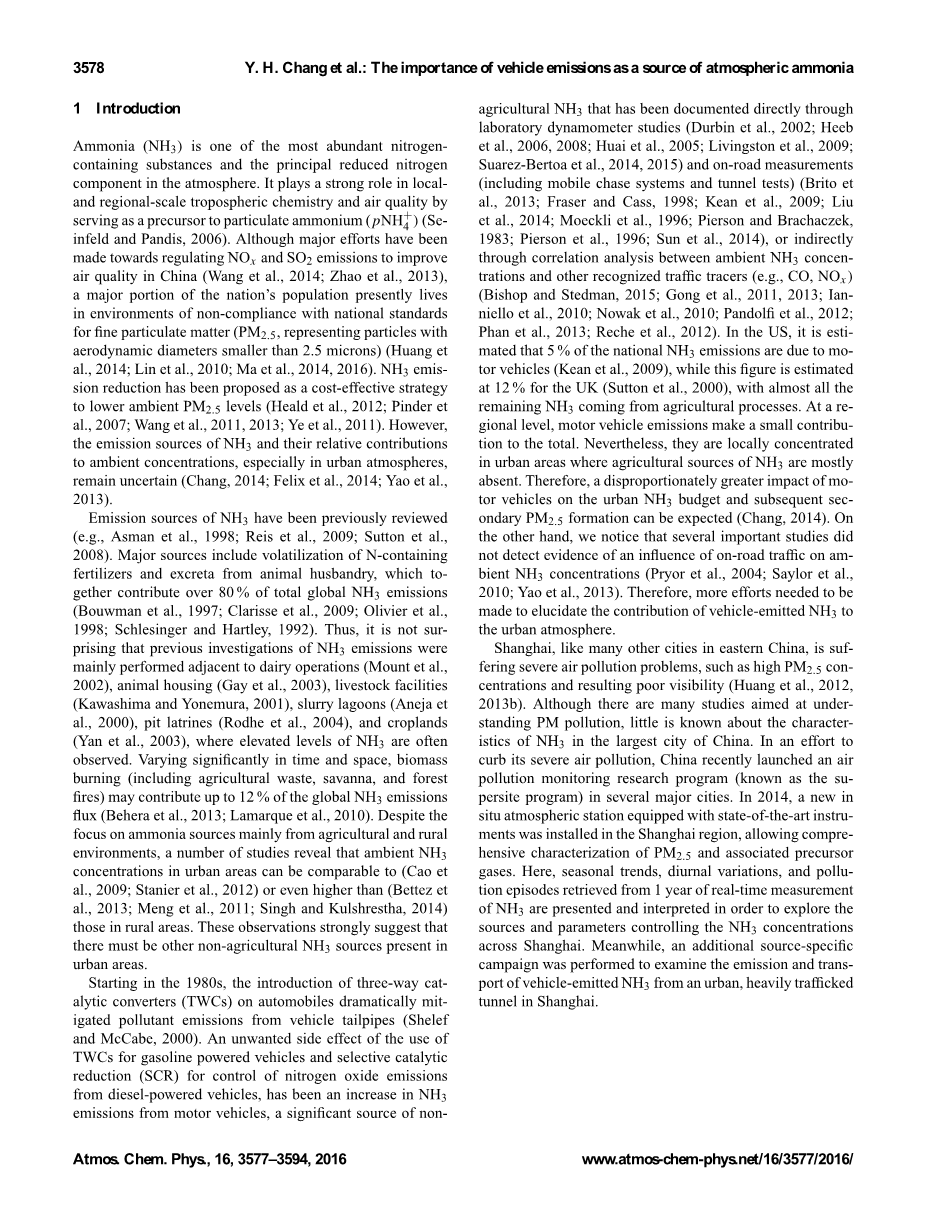 20世纪80年代开始,在汽车上引入三元催化转换器(TWC)大大减轻了汽车尾气管对NOX污染物排放(Shelef and McCabe,2000)。但使用以汽油为动力车辆和选择性催化的TWC用于控制氮氧化物排放的还原(SCR),机动车排放中NH3浓度一直在增加表明非农业NH3的重要来源(Durbin et al., 2002; Heeb et al., 2006,2008; Huai et al., 2005; Livingston et al., 2009;Suarez-Bertoa et al.,2014,2015)和道路测量(包括移动测量和隧道测试)(Brito et al., 2013; Kean et al., 2009; Moeckli et al., 1996; Pierson and Brachaczek,1983; Pierson et al., 1996; Sun et al., 2014),或间接的通过环境NH3浓度与其他交通源示踪剂(如CO,NOx )之间的相关性分析(Bishop and Stedman,2015; Gong et al., 2011,2013; Ianniello et al., 2010; Nowak et al., 2010; Pandolfi et al., 2012;Phan et al., 2013; Reche et al., 2012)。在美国,NH3排放量中5%来自汽车(Kean et al。,2009),而在英国排放量为12%(Sutton et al., 2000),剩余的NH3来自农业过程。在区域尺度上,机动车排放对总量的贡献很小。然而主要集中在城市地区,并且对城市机动车NH3浓度与PM2.5形成有着重要的联系(Chang et al., 2014)。目前很少对于道路交通对环境NH3浓度进行研究(Pryor et al., 2004; Saylor et al., 2010)。因此,需要阐明车辆排放的NH3对城市空气质量的影响。