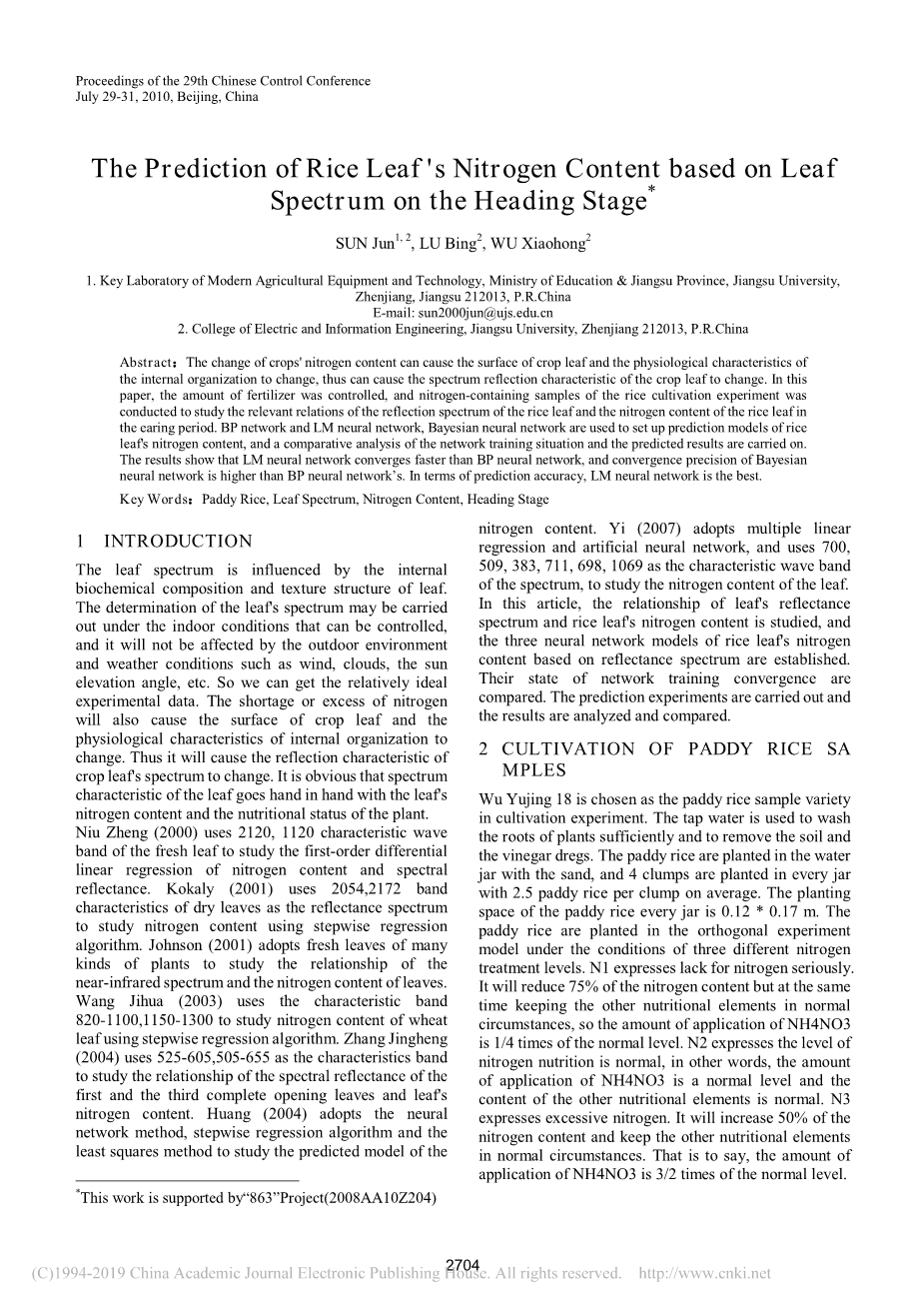 牛正(2000)利用新鲜叶片的2120,1120特征波段提出了氮含量和光谱反射率的一阶微分线性回归。Kokaly(2001)使用2054,2172干叶带特征作为反射光谱,使用逐步回归算法研究氮含量。 Johnson(2001)采用多种植物的新鲜叶子来研究近红外光谱与叶片氮含量的关系。王继华(2003)使用特征带820-1100,1150-1300,采用逐步回归算法研究小麦叶片氮含量。张景恒(2004)以525-605,505-655为特征带,研究了第一,第三完全开放叶片的光谱反射率与叶片氮含量的关系。Huang(2004)采用神经网络方法,逐步回归算法和最小二乘法研究了预测模型。Yi(2007)以多元线性回归和人工神经网络算法,并使用700,509,383,711,698,1069作为光谱的特征波段,研究叶片的氮含量。本文研究了叶片反射光谱与水稻叶片氮含量的关系,建立了基于反射光谱的三种水稻叶片氮含量神经网络模型,进行预测实验并分析和比较结果。