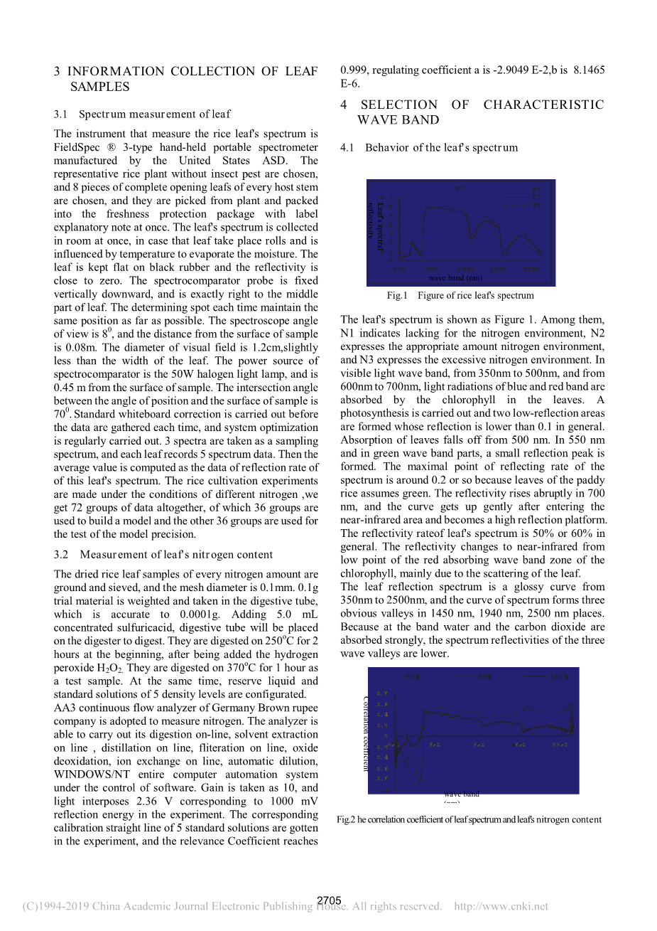 测量稻叶光谱的仪器是美国ASD制造的FieldSpecreg;3型手持便携式光谱仪。选择无害虫的水稻作为代表,指挥每个主茎中选择8个完整的开放叶片,直接装入带有标签说明的保险装中。为防止叶子发生滚动并且受温度影响导致蒸发水分,应该立即在室内收集叶片光谱。将叶片平整地放置于反射率接近于零的黑色胶带上。光谱仪探头垂直向下固定,使其正对叶片的中间部分。每次测试尽可能保持相同的位置。分光镜的视角为8°,距样品表面的距离为0.08m。视野直径为1.2cm,略小于叶片宽度。光谱仪的电源为50W卤素灯,距离样品表面0.45米。位置角与样品表面之间的交角为70°。每次采集数据之前进行标准白板校正,并定期进行系统优化。每个叶子记录5个光谱数据,将3个光谱作为采样光谱。然后计算平均值作为该叶子光谱的反射率数据。水稻培养试验在不同氮含量处理水平条件下进行,共获得72组数据,其中36组用于建模,其余36组用于模型精度检验。