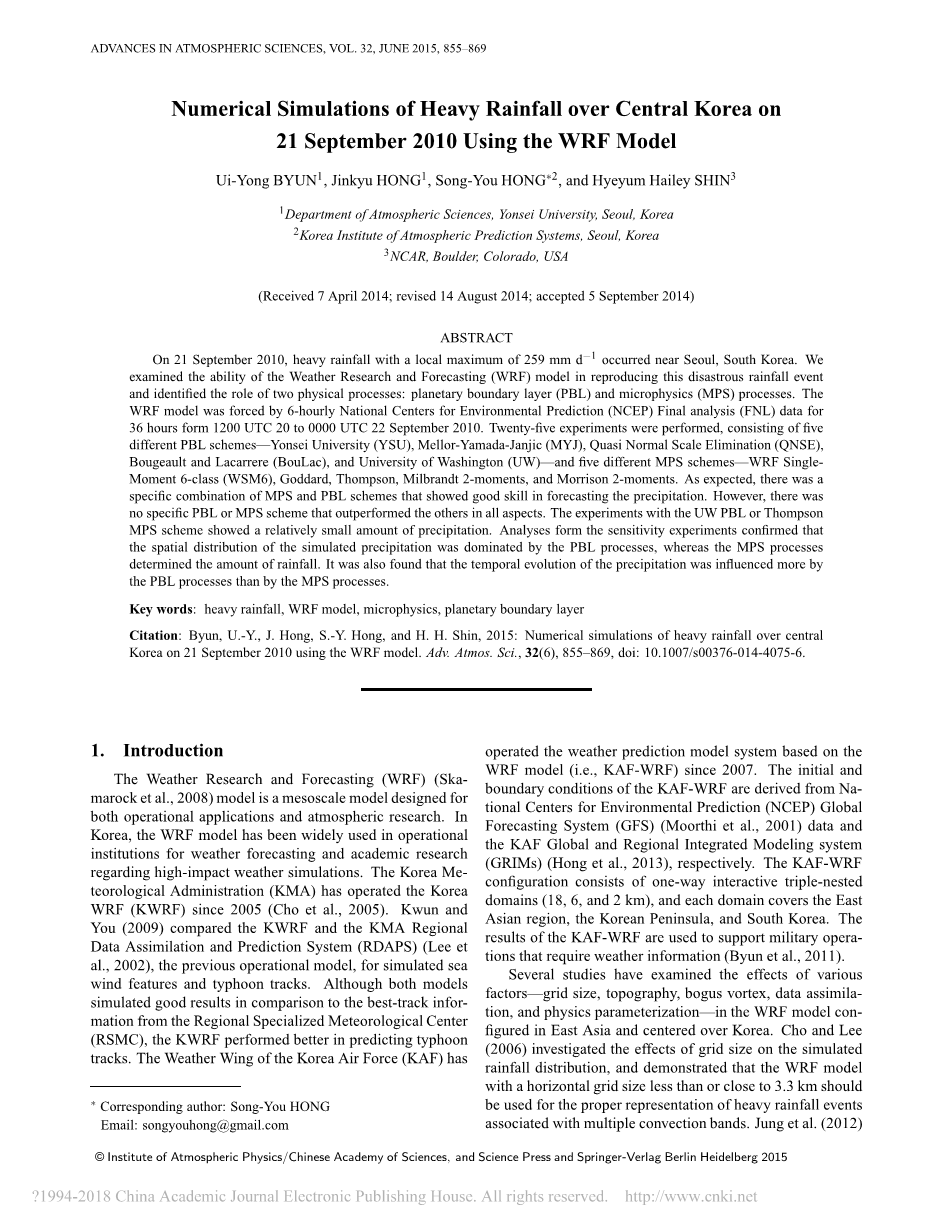 Ui-Yong BYUN1,Jinkyu HONG1,Song-You HONG * 2和Hyeyum Hailey SHIN31韩国延世大学大气科学系韩国首尔2韩国大气预报系统研究所3NCAR,美国科罗拉多州博尔德市(2014年4月7日收到; 2014年8月14日修订; 2014年9月5日接受)