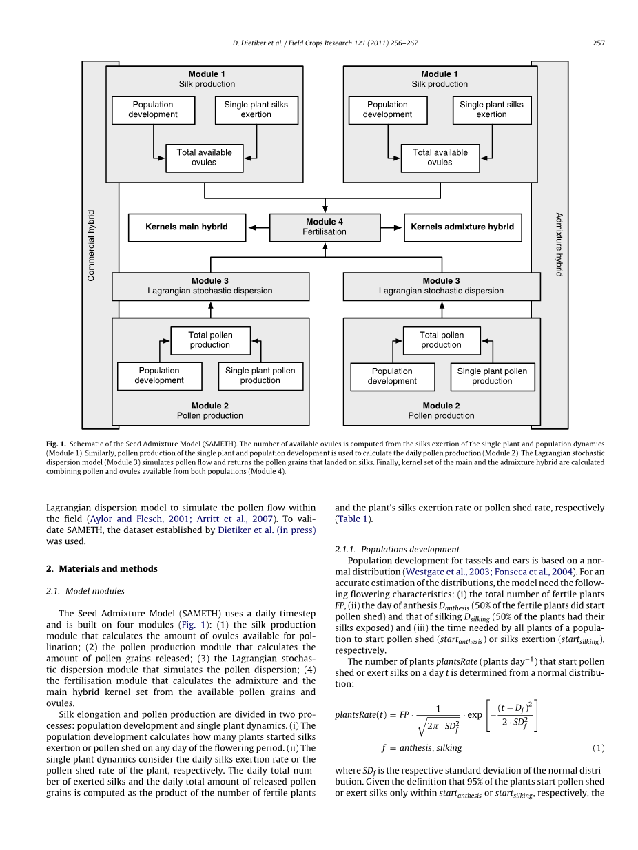 因此,本研究的目标是开发一种新的模型,作为上述模型的补充预测工具。ETH的新种子混合模型,我们在这里介绍的苏黎世(Sameth)模型结合了两种不同的方法:(一)玉米开花特性(花粉沉降和吸附)已经得到了很好的研究(e.g. Bassettiand Westgate, 1993a; Westgate et al., 2003)在数学上描述(e.g. Fonseca et al., 2003; Lizaso et al., 2003) (二)在田间范围内用一个拉格朗日散射模型模拟花粉流动(Aylor and Flesch, 2001; Arritt et al., 2007).为了验证Sameth,Dietiker等人建立的数据集。