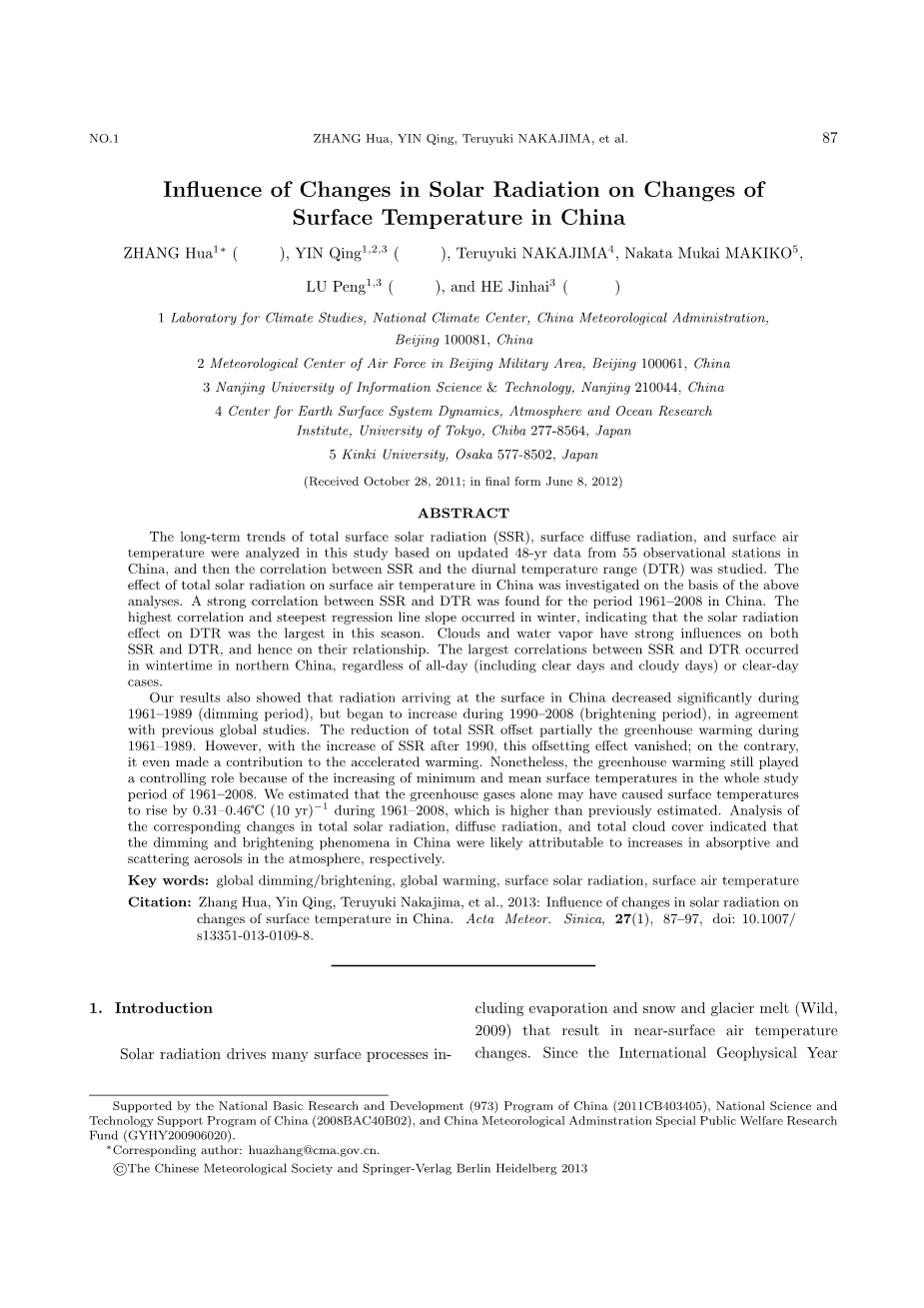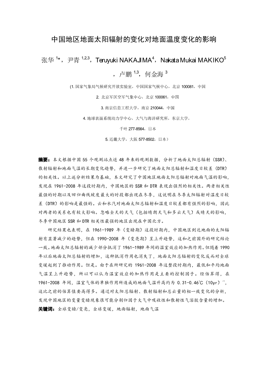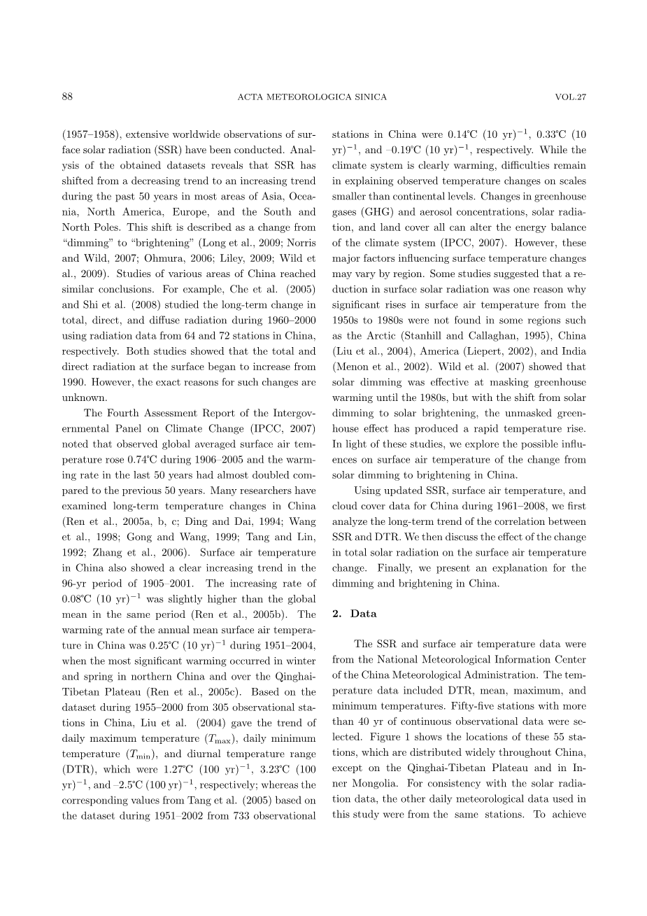 中国地区地面太阳辐射的变化对地面温度变化的影响外文翻译资料