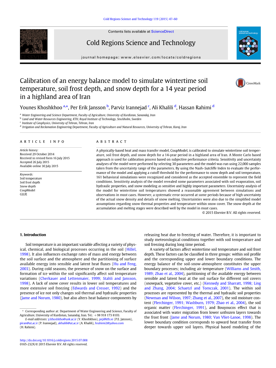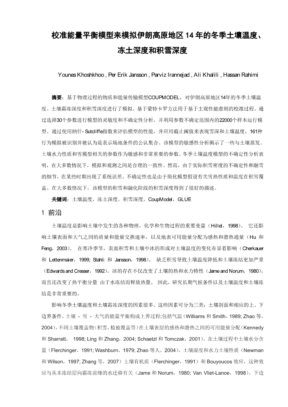 校准能量平衡模型来模拟伊朗高原地区14年的冬季土壤温度、冻土深度和积雪深度外文翻译资料