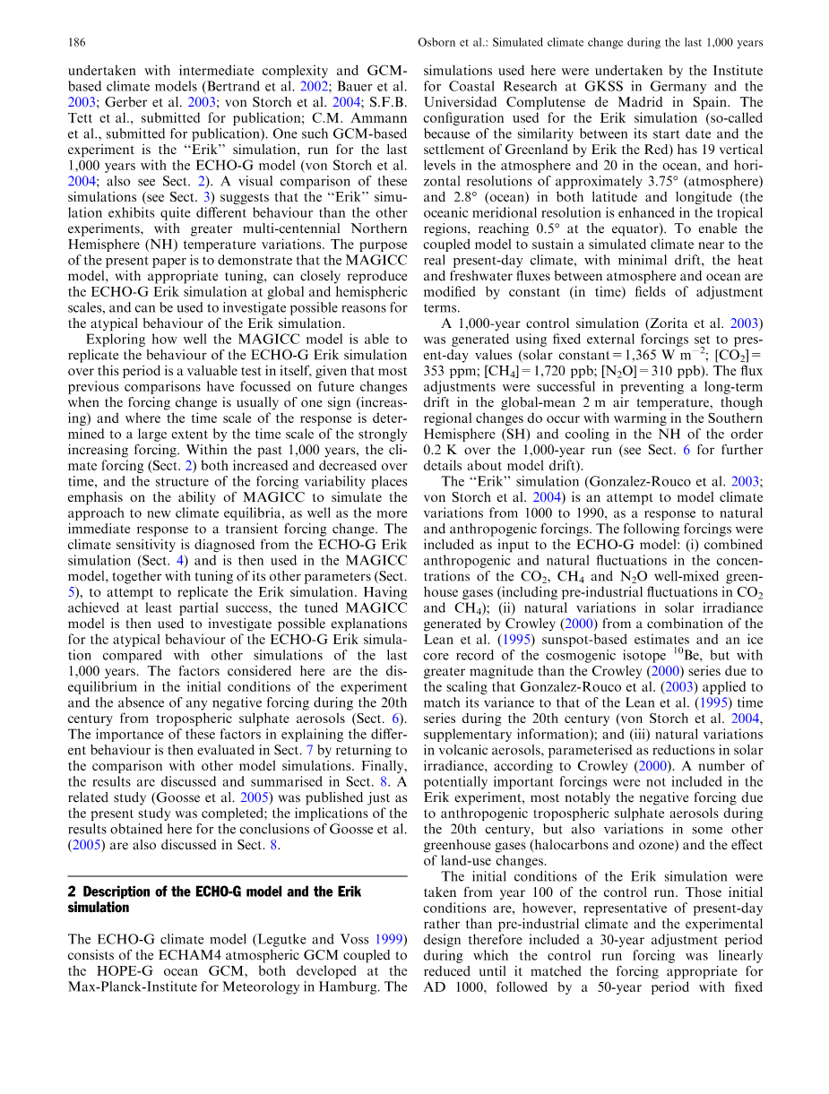 包括MAGICC在内的简单气候模型也被用于模拟对可能发生的较小辐射强迫变化的响应在近几个世纪和最后的千年中(例如,Free and Robock 1999; Crowley 2000; Crowley等人2003; Foukal等人2004)。在中等复杂性和GCM气候模式下也进行了类似的模拟(Bertrand et al。2002; Bauer et al.2003; Gerber et al。2003; von Storch et al。2004; SFBTett et al,提交出版; CM Ammann等人,提交出版)。一个这样的基于GCM的实验是“Erik”模拟,使用ECHO-G模型运行了近1000年(von Storch等人,2004年;也参见第2节)。 这些模拟的视觉比较(见第3节)表明了“Erik”模拟表现出与其他实验相当不同的行为,具有更多的百年一遇的北半球(NH)温度变化。本文的目的是证明MAGICC模型具有适当的调整能够在全球和半球尺度上严密地重现ECHO-G Erik模拟,并可用于调查Erik模拟的非典型行为的可能原因。