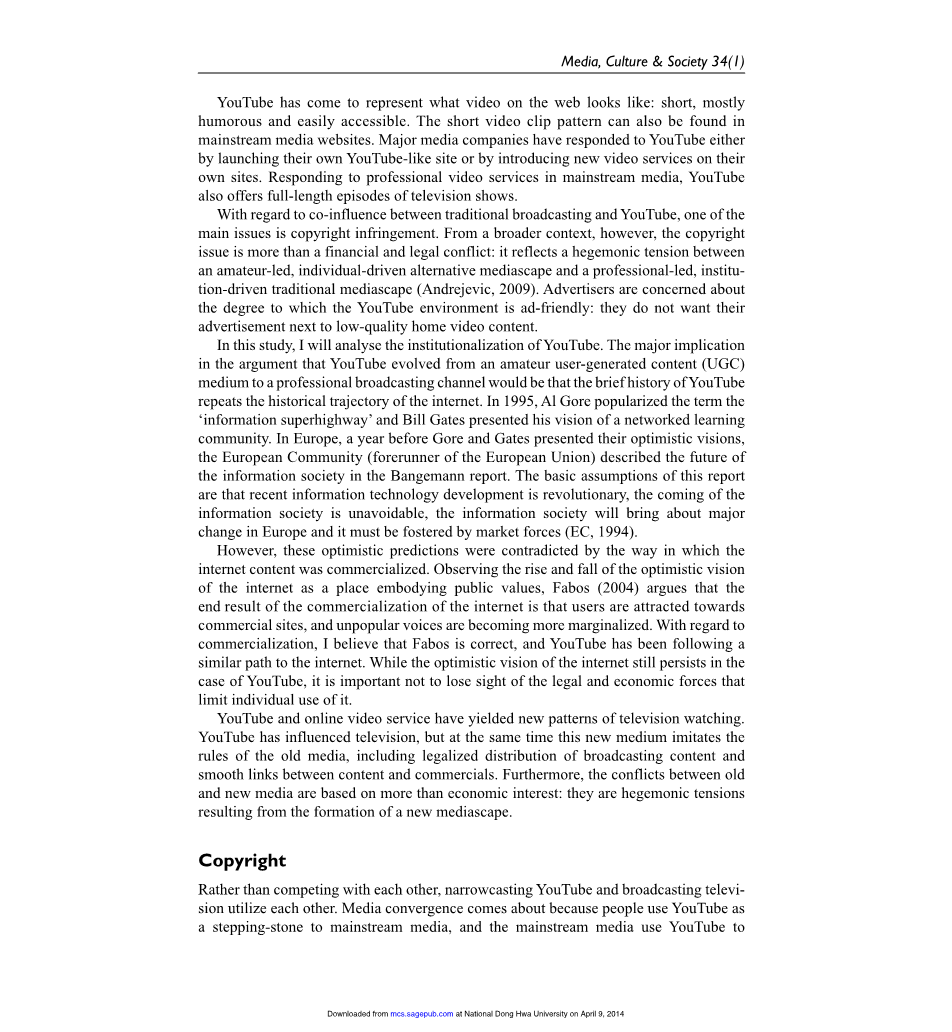 作为互联网和电视的融合媒介,YouTube凸显了传统广播与数字窄播之间的一系列矛盾。不能仅仅将YouTube认定为是一种革命性的媒介,因为它同样受到传统媒介(即网络广播公司和电视观众)、内容(即节目类型和风格)和机构(即版权和广告)的影响。
