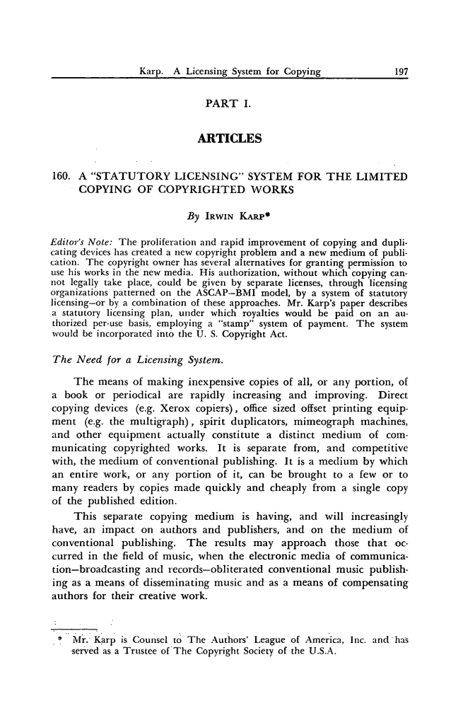 编者注:随着复制与复制设备的增长与快速提高,产生了新的版权问题和新的出版媒介。版权所有人对于给予在新媒介下使用他的作品的许可有几种选择。他的授权,没有该授权复制违法,可以通过单独许可、通过许可组织模仿ASCAP-BMI模式、通过法定许可系统或者通过这些许可方法的结合给予。Mr.Karp的文章描述了一个法定许可方案,该方案下版税交付是以已授权的每次使用为基准,采用一种“邮票”支付系统,该系统将被纳入美国版权法。