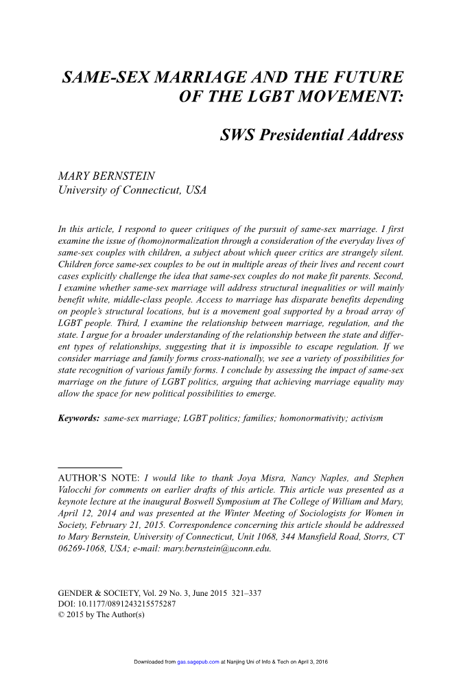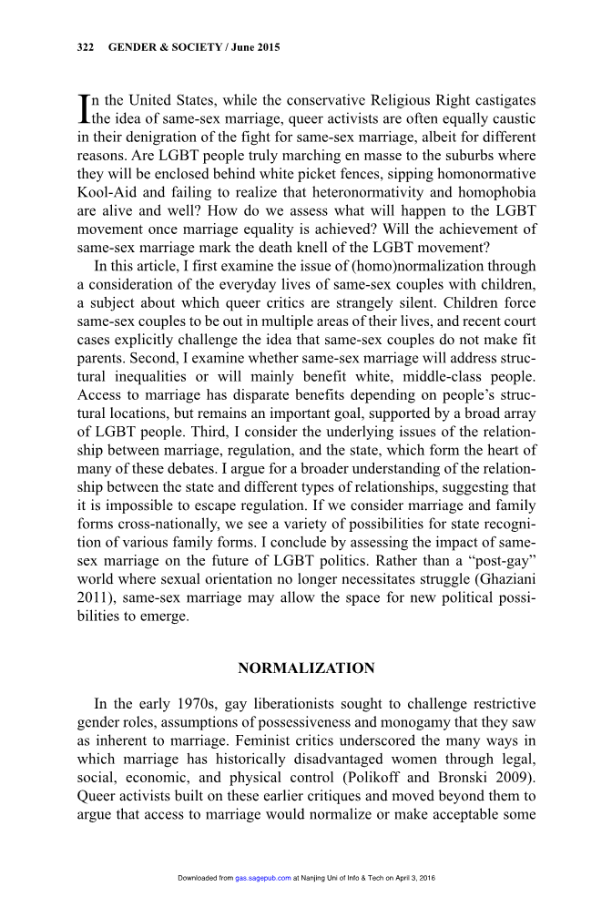 在这篇文章里,我回应了批判追求同性婚姻一事。首先,我通过考虑同性伴侣与孩子们的每日相处活动,来检验同性恋是否正常化。这样的主题研究以前还从未出现过。孩子们强迫同性伴侣在不同的场合陪他们外出,并且最近的法院案例告诉我们同性伴侣不适合做孩子的父母。其次,我考察了同性婚姻是否会导致结构性不平等或主要受益是白人和中产阶级一事。婚姻能否带来各种利益取决于双方的社会地位,但这场运动由大量同性恋婚姻支持者在背后力挺。第三,我审视了婚姻、法规和国家之间的关系。我主张用不同的想法来思考国家和其他个体或团体的关系,这表明它是不可能逃脱监管的。如果我们考虑跨国婚姻和跨国家庭,我们看到的是各种各样的可能性存在于各种家庭形式状态中。最后,我评估了同性婚姻对未来同性恋政治的影响,我认为要实现婚姻平等必须要有新的政策出台。