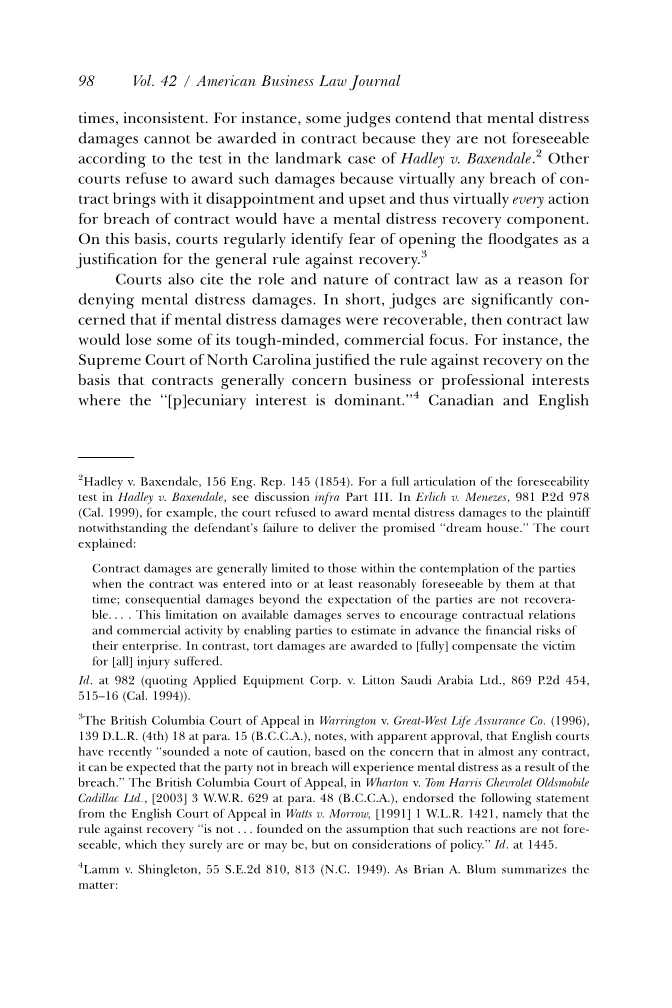 示例(2)和(3)更接近于Hadley规则,但依赖于糟糕的葬礼和整形手术的极端事实。在示例(2)中,感情上的痛苦很可能是违约的自然结果。为葬礼服务。例如(3),整容手术失败的例子大概是为了显示特殊情况。当事人在签订合同时所知道的情况,即原告是专业艺人。然而,这份合同也可能属于同例(2)一样,精神痛苦是畸形和需要额外手术的自然结果。