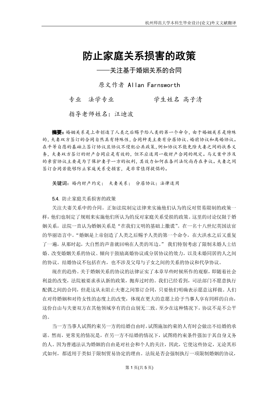 防止家庭关系损害的政策--关注基于婚姻关系的合同外文翻译资料