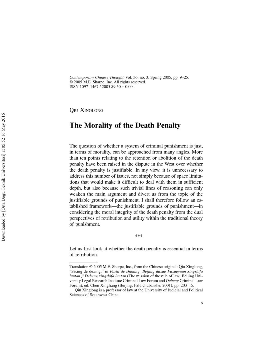 ——节选翻译QIU XINGLONG,《The Morality of the Death Penalty》[J], Contemporary Chinese Thought, Spring 2005, Page9-15