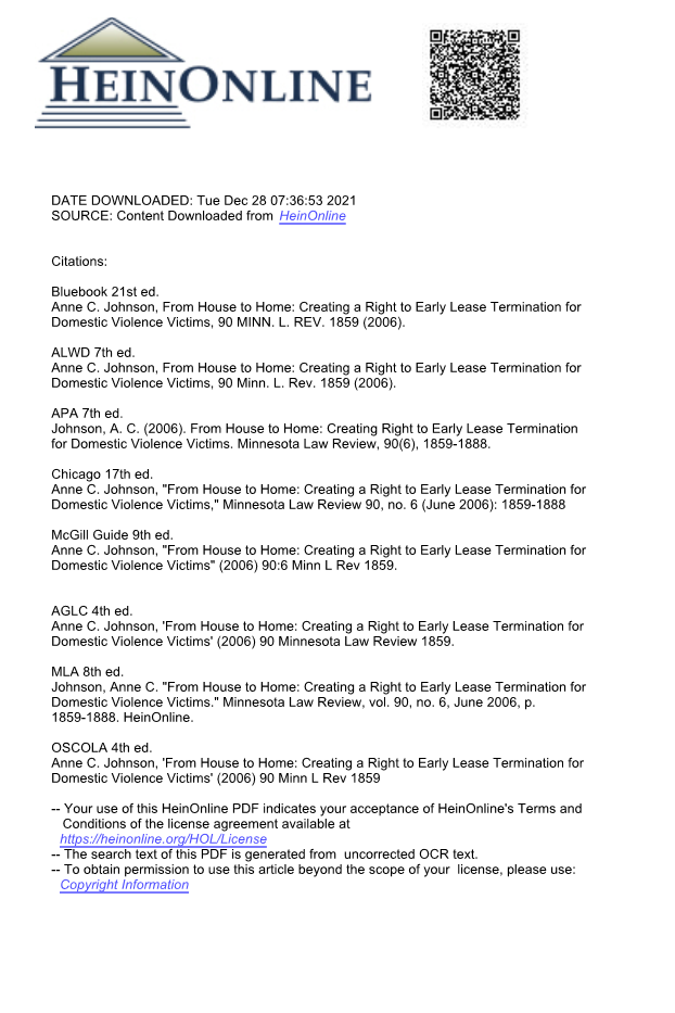 本说明将研究为家庭暴力受害者提供提前终止权利的州法律的必要性和合法性。本说明将审查各州法律的必要性和合法性,这些法律规定家庭暴力受害者有权终止租房协议而不受惩罚,以逃避虐待。第一部分描述了提前终止协议的法规如何效益、房东、其他租户和整个社会。第二部分解释了为什么更多的州必须制定早期终止法规,以保护家庭暴力受害者的租赁住房。第三部分展示了提前终止法规如何融入财产理论以及它们在实践中与财产法的关系。第四部分提出了以下策略争取在州一级对提前终止法规的支持。这些法律消除了一个经济障碍,否则可能会阻碍受害者离开他们的施虐者。在倡导者、房东和立法者的帮助下,各州可以改革他们的房东-租户法,以消除这一障碍。