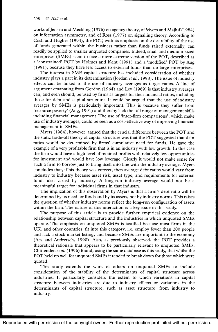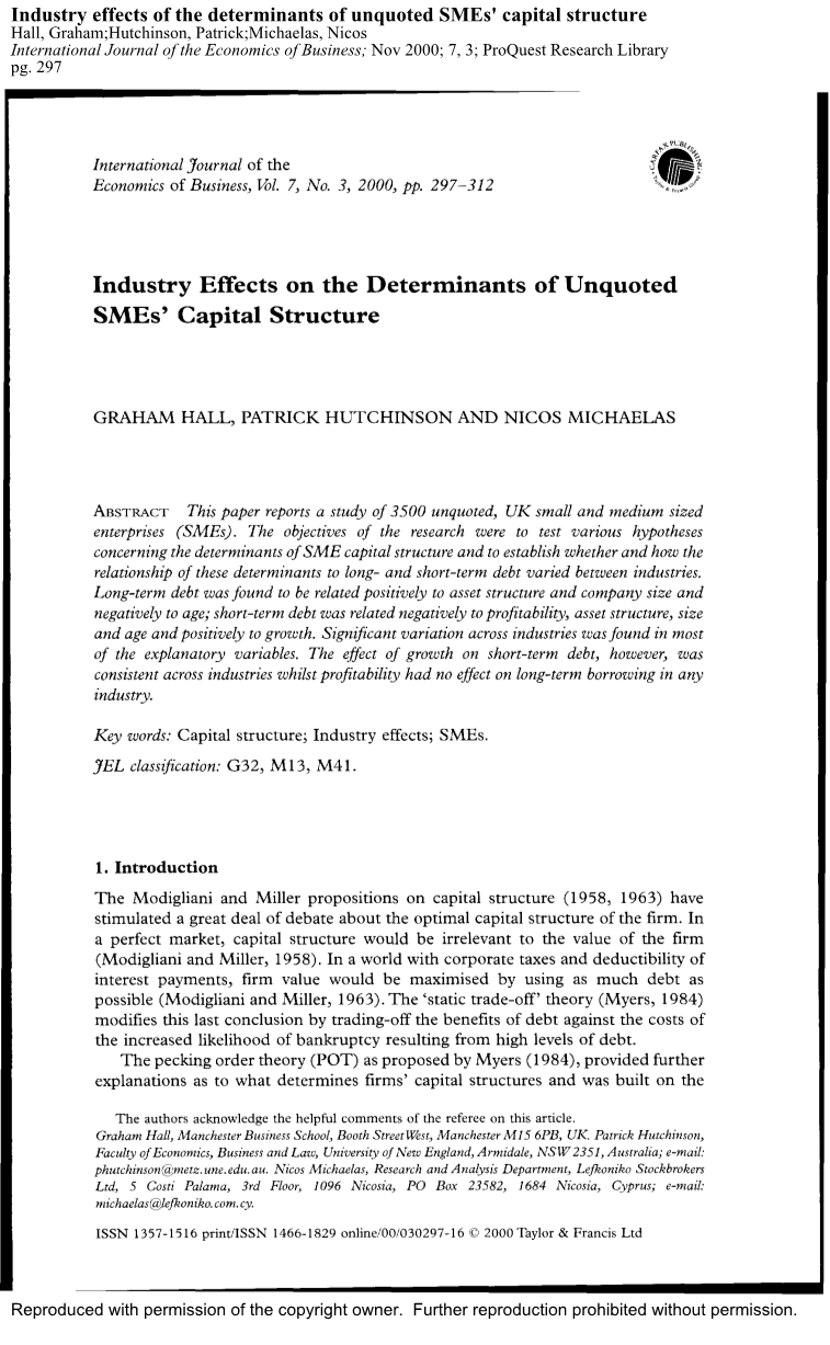 这项研究拓宽了对于未上市中小型企业的研究范围,包括考虑各个行业资本结构的稳定性。它特别考虑到在行业间的资本结构变化的程度是由于在决定资本结构中行业的影响或变动,比如行业间资产结构的不同。