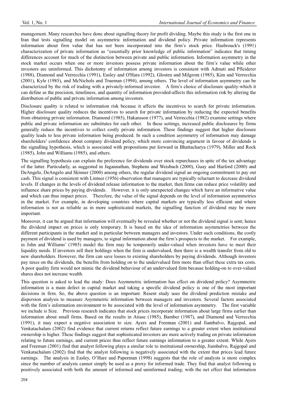 Khang 和King(2006)表明了股利数量和个人市场中的交换效率之间具有有意义的负相关关系。信息信号理论并没有接纳这个研究的结果。