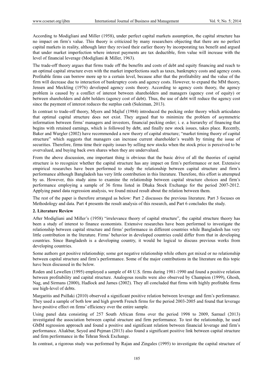 从上面的讨论中可以看出,很重要也很明显的一点就是,所有资本结构理论的基本驱动都是确认资本结构是否对公司绩效有影响。大量的实证研究方法执行并研究了资本结构与公司绩效之间的关系,尽管孟加拉国在文学方面的贡献很小。因此,这项工作由我们尝试。然而,本研究旨在探讨资本结构决策和公司绩效之间的关系,并采用36个在达卡证券交易所上市的公司2007 - 2012年间的数据为样本。运用面板数据回归分析,我们发现了它们之间复杂的关系。