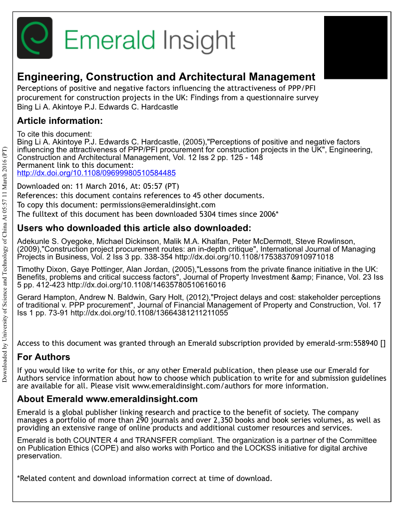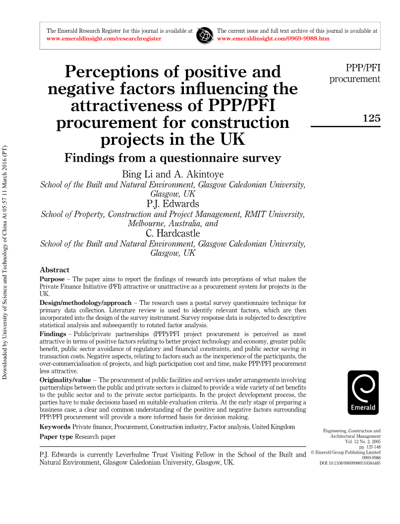 结果—公共/私人合作伙伴关系(PPP)/ PFI采购项目就积极因素而言,被认为是最具有吸引力的,关于在更好的工程技术和经济、更大的公共利益、公共部门回避监管和金融约束 和公共部门节约的交易成本方面。消极方面,相关因素如参与者经验不足、项目的过度商业化和高的参与成本与时间,使PPP / PFI采购缺乏吸引力。