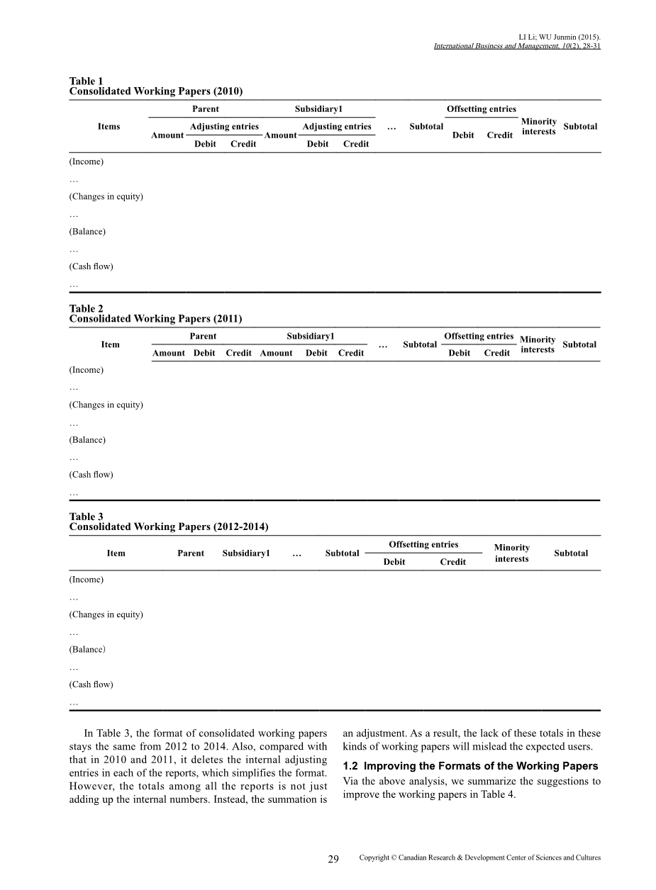 图二中展示的2011合并财务报表工作底稿与2010工作底稿类似。虽然内部调整分录被抵消,但是它依然在工作底稿中呆板地列示了每个内部报表的借贷科目,而报表使用者只是需要一个总的金额数。使用者们仅仅需要知道哪个科目要作调整,并不需要去区分是哪个具体成员公司的个体数据。因此,这些在合并报表工作底稿中存在的调整分录需要作修改。