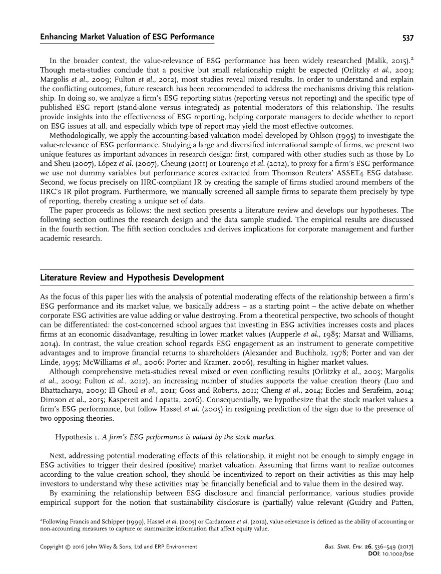 在更广泛的背景下,对ESG绩效的价值相关性进行了广泛的研究(Malik,2015年)。2尽管荟萃研究得出的结论是可能存在积极但较小的关系(Orlitzky等人,2003年;Margolis等人,2009年;Fulton等人,2012年),但大多数研究都得出了混合的结果。为了理解和解释冲突的结果,建议未来的研究解决驱动这种关系的机制。在此过程中,我们分析了一家公司的ESG报告状态(报告与未报告)以及作为此关系潜在主持人发布的ESG报告的具体类型(独立与综合)。这些结果提供了对ESG报告有效性的洞察,帮助公司经理决定是否报告ESG问题,尤其是哪种类型的报告可能产生最有效的结果。