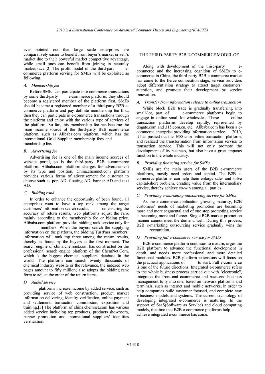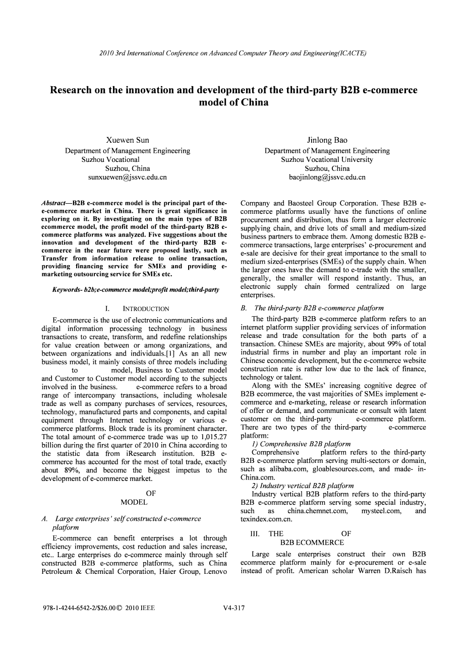 - Han Tingjin, Qian Zhixin, 'A deep development of B2B e-commerce platform model[J]', Jiangsu Commercial Forum, no. 4, pp. 55-57, 2009.