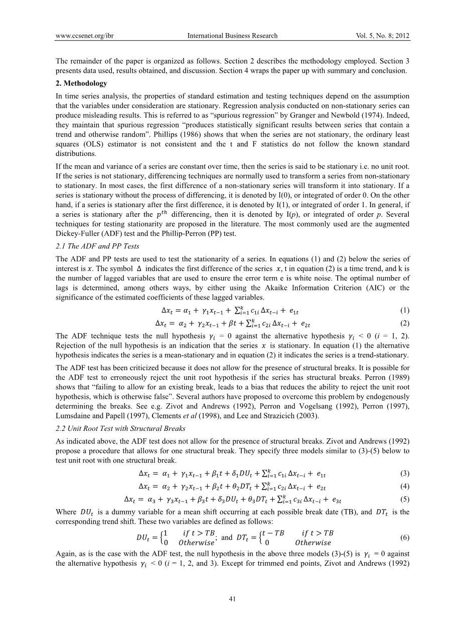 ADF和PP检验是用来检验一个序列的平稳性。在方程(1)和(2)以下的一系列的利益是。符号∆表示该系列的第一个差异,t的方程(2)是一种时间趋势,而钾则是用来保证误差项的滞后变量的数目是白噪声。的最佳数目的滞后被确定,其中通过使用的Akaike信息准则(AIC)或这些滞后变量的估计系数的意义。