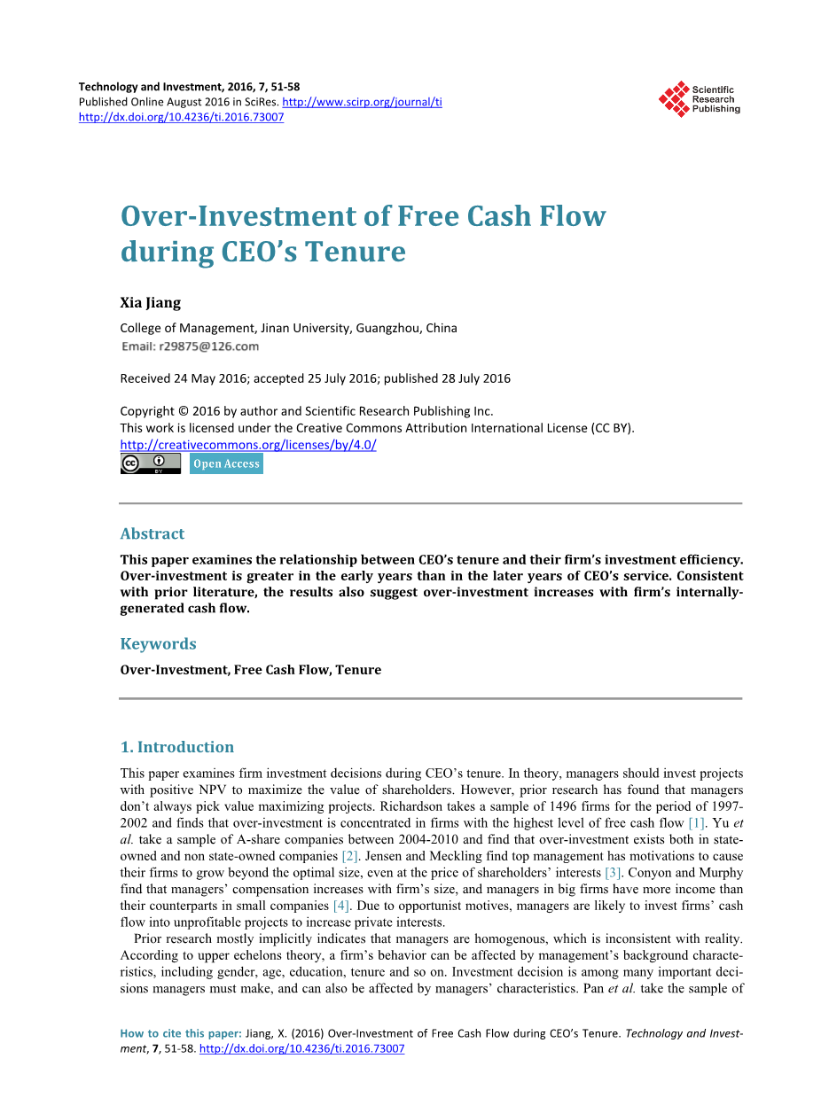 在内部产生丰富的现金流的情况下,过度投资可能会变得严重。在完美的资本市场中,公司的投资活动不会受到内部产生的现金流量的影响。如果一家公司需要额外的现金来为一项投资活动提供资金,它只需从外部资本市场筹集这笔现金。如果公司的现金额超过为净现值项目(包括对未来投资的选择)提供资金所需的额外资金,它将向外部市场分配自由现金流量。然而,公司并不是在这样一个完美的世界中运作。资本市场摩擦可能会阻碍管理层从外部资本市场筹集现金流的能力。现金流动更加波动的公司会希望在现金流量低的时期保留现金,而发现筹集外部资本更困难的公司会希望拥有更多的现金(例如Opler等人[11])。此外,管理层并不总是为最大化股东价值而采取行动。当管理者的目标与股东不同时,管理者可能会挥霍内部产生的现金流量。之前的研究表明,管理者有动机投资更多,即使牺牲股东利益。 Conyon和Murphy发现,管理人员的薪酬随着企业规模的增加而增加,大企业的管理人员比小企业的管理人员更多[4]。贝克等人。发现投资可以为中层管理人员提供更多的促销机会,这可能会使管理人员对投资产生偏见[12]。 Wang等人发现管理者可以通过减少股息支付来降低公司的投资效率[13]。因此,管理层可能会对自我服务项目进行额外投资,而不是将现金分配给股东。因此,第一个假设是: