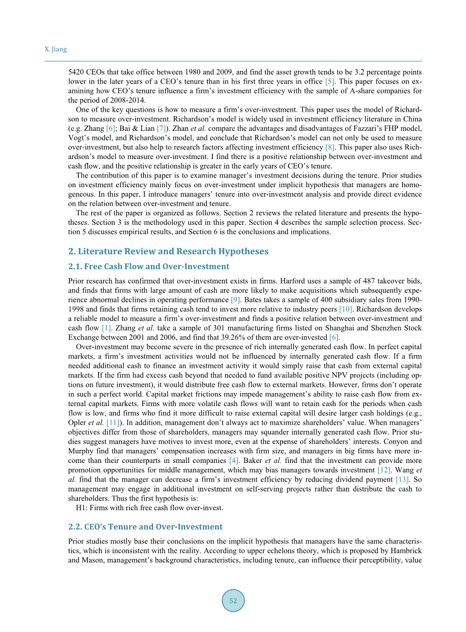 先前的研究大多隐含表明管理者是同质的,这与现实不符。根据上层理论,企业的行为会受到管理层的背景特征的影响,包括性别,年龄,教育程度,任期等。投资决策是管理者必须做出的许多重要决策之一,也可能受到管理者特征的影响。潘等人以1980年至2009年就职的5420位首席执行官为样本,发现首席执行官任期后的资产增长比前三年下降3.2个百分点[5]。 本文重点阐述了首席执行官的职位如何影响公司2008 - 2014年期间A股公司样本的投资效率。