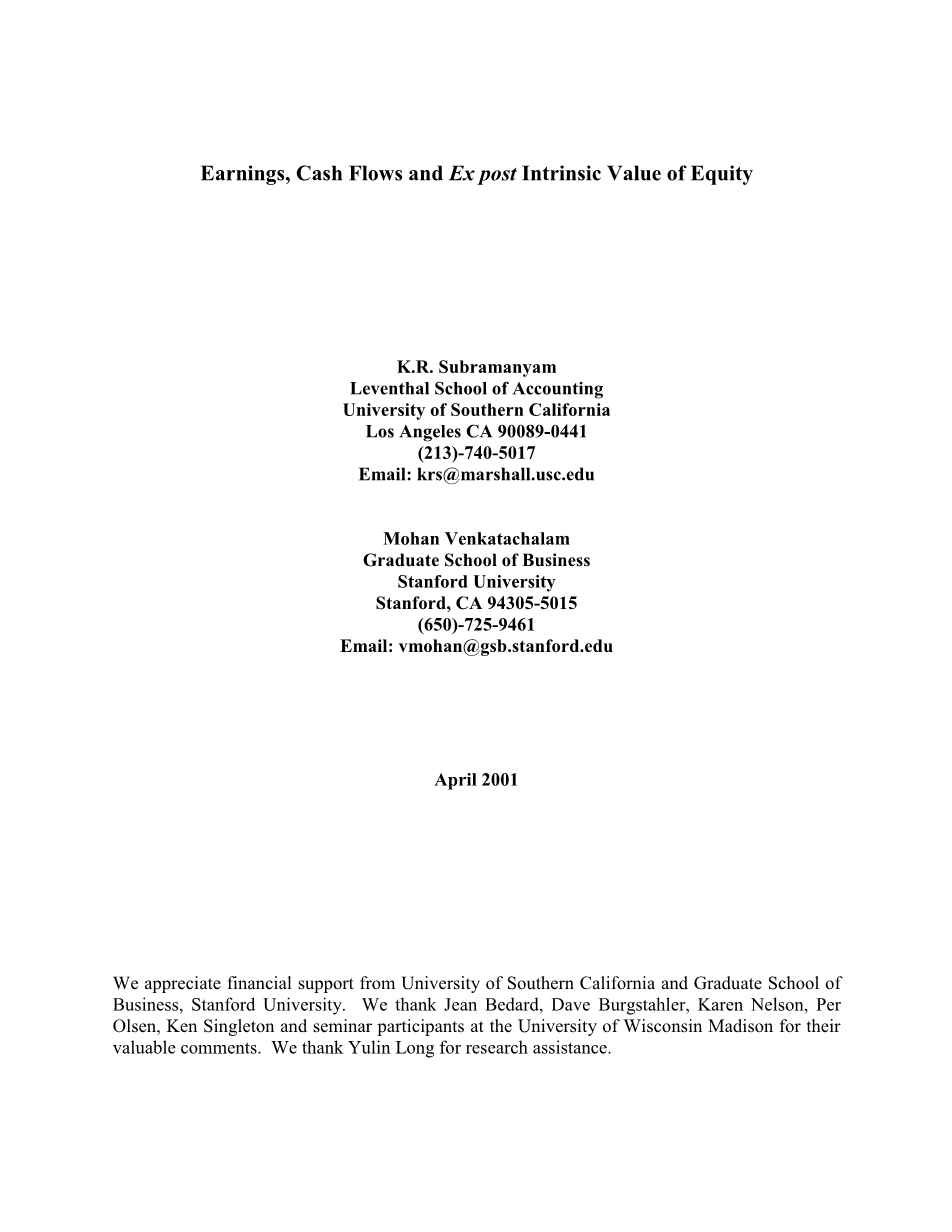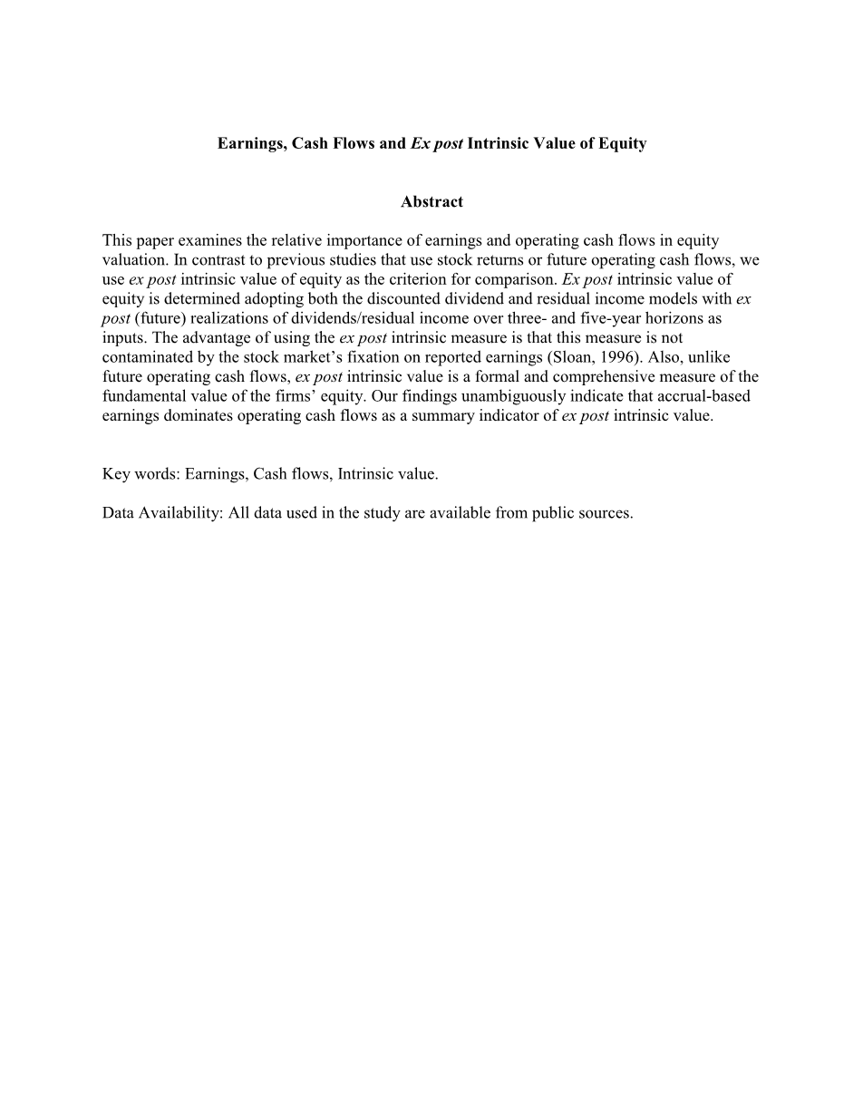 会计基本问题是权责发生制收益和现金流量提供与财务业绩衡量和股权估值相关的信息的相对能力。虽然这个问题已经得到了广泛的研究,但关于现金流量与收益作为股权价值总结指标和衡量公司财务业绩的相对优越性之间的争论仍然没有得到解决。我们通过研究收益和现金流量在解释权益的事后内在价值方面的相对能力,为这一重要的研究领域做出贡献。我们确定股权的事后内在价值,同时采用折现股息和剩余收益模型。作为这些模型的输入,我们使用事后(未来)实现三年和五年期间的股息/剩余收入以及终期价值计算期末的市场价值。根据金融标准会计委员会(FASB)的断言(FASB 1978,#44),我们发现应计制的收入占经营现金流量的主要指标,作为事后内在价值的总结指标。 之前的研究采用两种不同的方法来调查收益和现金流量对股权估值的相对重要性。一些研究使用股票价格作为基本股票价值的代理,并记载了在解释同期股票价格或收益时收益优于现金流量。例如,Dechow(1994)证明股票收益率与收益率高于现金流量1.这种研究中隐含的假设是股票价格准确地反映了当前收益和当前经营性现金流量中包含的未来现金流量信息。然而,Sloan(1996)和Barth和Hutton(1999)的证据表明,股票市场参与者似乎注意到当前的收益,而没有考虑其应计和现金流分量的差异化持续性。 因此,由于收益能够更好地反映价值相关信息的能力或由于股票市场固定收益,所以不清楚收益(相对于现金流)的优越解释能力是否出现。