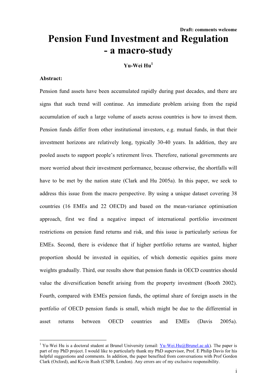 由于人的寿命越来越长,如何解决人口老龄化的问题已经出现在政府的议程中。当前关于社会保障系统的转变趋势,是从短期计划来说的。例如:现收现付资助计划。如果市场条件返回大于人口增长率,资助养老金制度是更适当的。然而,资助计划被认为是有相关的一些缺点的,如高转换成本。尽管局部争论资助系统的优缺点,但世界各地的许多政府资助的退休金计划显示了他们对此强烈的兴趣,不仅仅是由于世界银行的推动的结果。养老基金,作为积累资产由赞助商和受益人双方提供的延期支付来保障未来养老金福利受益者的权利,在最近几十年,养老金在世界各地显著增加。此外,几乎可以肯定的是,养老基金在未来几十年将继续快速扩张。由此引发的问题如此庞大的资产在许多国家是如何投资。养老基金不同于其他形式的投资,如共同基金,因为他们的投资周期相对较长。此外,其他投资形式,如共同基金,往往只承担证券选择,是通过对指定的资产进行投资,而养老基金通常考虑的是证券选择和资产配置。与此同时,由于养老基金池资产是用来支持人们的退休生活,国家政府特别关注他们的投资收益和相关风险。如果养老基金管理很差,无法支付退休人员的养老金收入,在适当的时候,政府可能没有政治选择,会使用财政成本来满足这些损失。因此,如何确保养老基金的管理成为各国政府日益重要的问题。在本文中,我们从宏观角度寻求解决这一问题。剩下的只是用以下方式的组织。第二节的问题是不同的投资策略与不同的养老金计划。在三和四部分,我们考虑参数和投资限制,特别是在外国投资。第五部分是实证部分,借助均值-方差框架,我们用实证分析的方法分析养老基金投资限制的国家监管机构是否合理,如果合理,到什么程度。第六节总结。