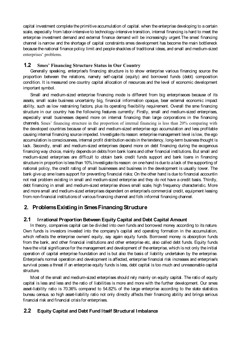 中小企业融资模式不同于大企业,因为它 资产,小规模经营不确定性大,金融信息不透明,承受外部经济影响 能力,如低限制因素,加上操作灵活性要求。总的来说,中小企业融资 我们国家的结构目前有以下特点:第一,中小企业, 特别是小型企业更多地依赖于内部融资而不是大型企业的融资 频道。中小企业的融资结构在内部融资中所占比例低于20% 发达国家由于中小企业的自我积累和利润较低 导致内部资金来源受到阻碍。调查其原因:企业管理水平低,自我积累意识低,内部利润分配存在于长期,长期的商业思想是所缺乏的。其次,中小型企业在外生的过程中更多地依赖于债务融资 融资方式的选择,主要取决于银行贷款和其他银行的债务。但是很小, 中等规模企业难以获得银行信贷资金支持和银行贷款 比例结构小于10%。调查其原因:一方面是由于缺乏对其的支持 国家政策、小企业信用评级和企业发展通常都较低。 银行给我提供贷款支持以防止金融风险;另一方面,是由于财务会计。 这不是中小企业存在的真正问题,它们没有信用基础。第三, 中小企业的债务融资规模小、频率高。 更多的中小企业依赖企业的商业信贷,设备租赁 从各种融资渠道和民间非正式融资渠道的非金融机构。