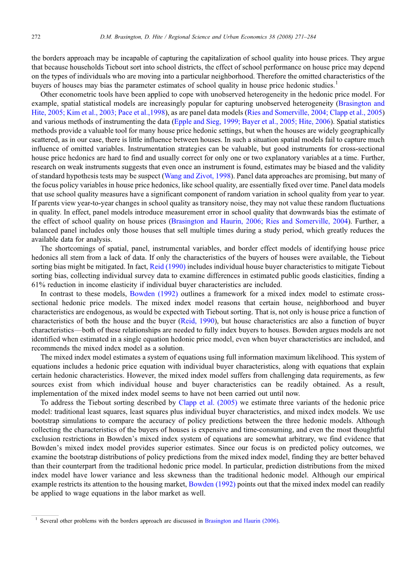 在Tiebout的著名的研究文章中(Tiebout,1956年)描述了住房市场中个人如何根据当地公共设施情况和对住房的个人内在喜好来选择房产的情况。由研究得知对公共设施的要求和房屋的个人偏好的主观性,也会对房价的估计产生相当的影响。还有Bartik(1987),Epple(1987),Brown和Rosen(1982)等人也都已经认识到了这一点。Rosen(1974)为解决这一问题提出结构性需求模型的问题,但是他注意到在第一阶段模型中,主观意志性是一直存在的现象,无法将其完全量化。还有Bayer等人(2005)在研究中指出,在大多数特征价格模型研究中,参数估计都存在一些偏差,原因可能与邻里变量,难以测度的住房质量,社区质量以及主观喜好相关。麦克米伦(2006)进一步认识到,如果将将富裕家庭与郊区住宅进行划分,来解决变量的难以测度问题,模型的研究仍然可能会产生许多偏差问题。因此,如果利用现有数据,可能会无法确定特征价格模型的具体形式,贸然进行参数估计可能反而会得出不正确的结论。最近,许多研究都开始倾向于研究与Tiebout的研究相关的问题。拜耳等人(2005)选择采用Black(1999),Cushing(1984)和Gill(1983)的边际回归方法来解决偏差的问题。但是Clapp等人(2005)认为提出仅仅修改边际回归方法来解决问题的话,可能导致无法将学校质量好坏的进行量化,纳入房价的评估当中。并且认为,如果Tiebout进行了学区的分类,那么学校这一要素对房价的影响可能会取决于位于特定社区的个人的主观选择,而不是客观要素。因此,房屋买家会更加重视房价优惠程度这一因素,忽略了学校的质量好坏问题,而导致研究中学校质量的参数估计产生偏差。