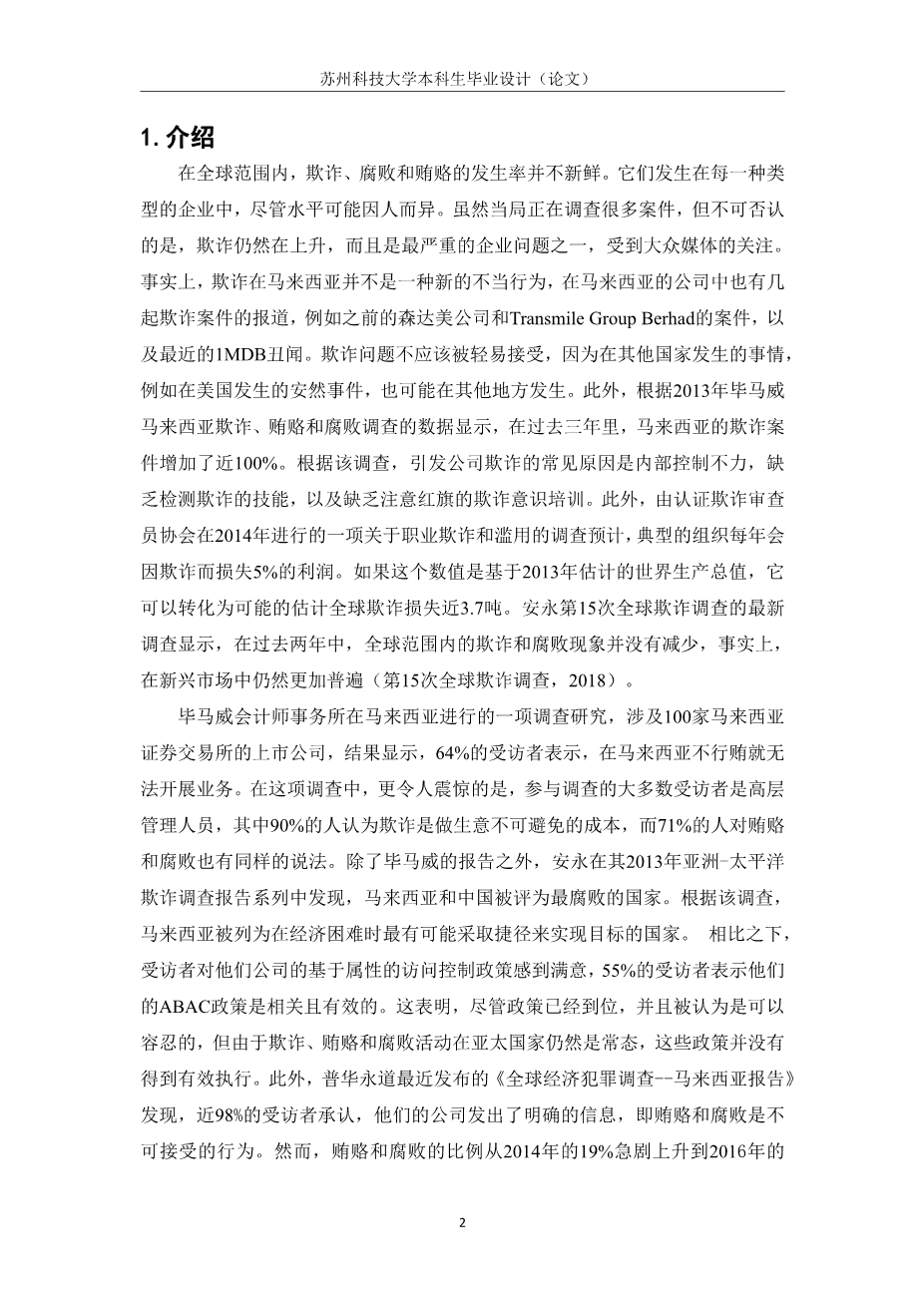 在全球范围内,欺诈、腐败和贿赂的发生率并不新鲜。它们发生在每一种类型的企业中,尽管水平可能因人而异。虽然当局正在调查很多案件,但不可否认的是,欺诈仍然在上升,而且是最严重的企业问题之一,受到大众媒体的关注。事实上,欺诈在马来西亚并不是一种新的不当行为,在马来西亚的公司中也有几起欺诈案件的报道,例如之前的森达美公司和Transmile Group Berhad的案件,以及最近的1MDB丑闻。欺诈问题不应该被轻易接受,因为在其他国家发生的事情,例如在美国发生的安然事件,也可能在其他地方发生。此外,根据2013年毕马威马来西亚欺诈、贿赂和腐败调查的数据显示,在过去三年里,马来西亚的欺诈案件增加了近100%。根据该调查,引发公司欺诈的常见原因是内部控制不力,缺乏检测欺诈的技能,以及缺乏注意红旗的欺诈意识培训。此外,由认证欺诈审查员协会在2014年进行的一项关于职业欺诈和滥用的调查预计,典型的组织每年会因欺诈而损失5%的利润。如果这个数值是基于2013年估计的世界生产总值,它可以转化为可能的估计全球欺诈损失近3.7吨。安永第15次全球欺诈调查的最新调查显示,在过去两年中,全球范围内的欺诈和腐败现象并没有减少,事实上,在新兴市场中仍然更加普遍(第15次全球欺诈调查,2018)。